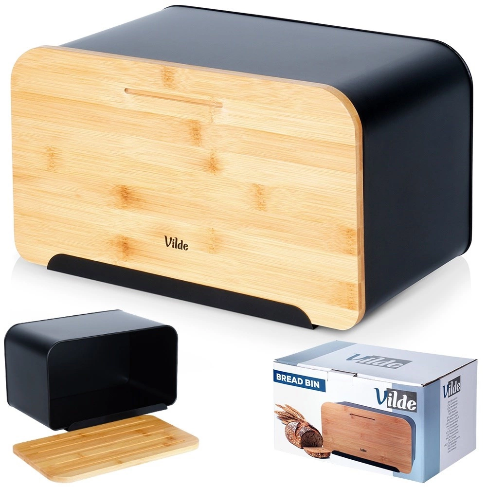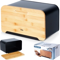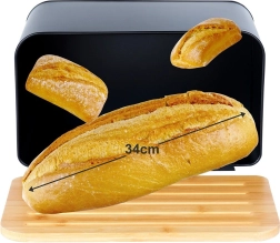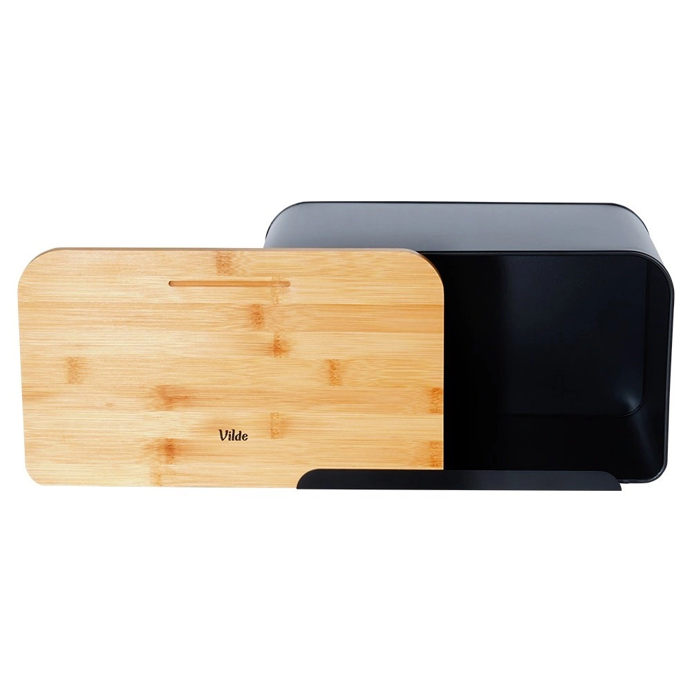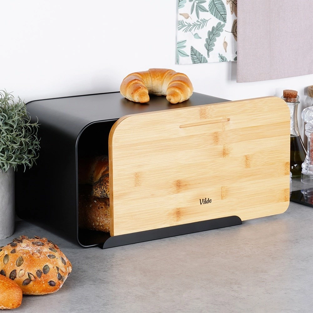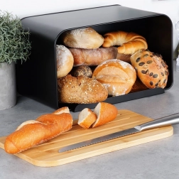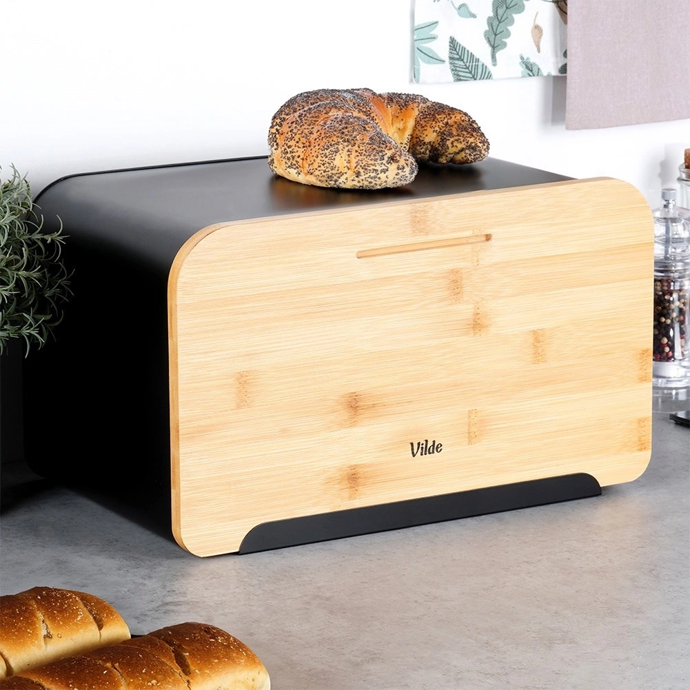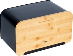 Модерна кутия за хляб в комбинация от матов черен метал и естествен бамбук, която ефективно ограничава достъпа на въздух, така че печивата остават по-дълго меки и вкусни. Масивното метално тяло е устойчиво и предпазва от механични повреди на печивата, докато естественият капак внася топлина и елегантност в кухнята.