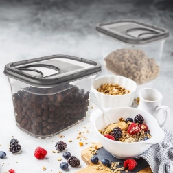 Подредете килера и кухнята. Този контейнер от серия Grey е идеален за кафе, зърнени закуски, паста, ядки, мюсли или сушени гъби. Благодарение на прозрачните стени лесно виждате наличността, а дозиращият капак позволява удобно и чисто изсипване без сваляне на целия капак.