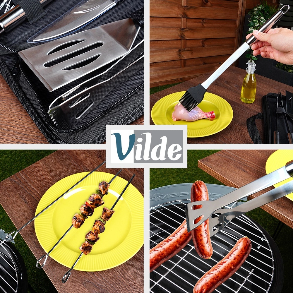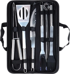 Пълен комплект за барбекю с издръжлив калъф, който съдържа всичко необходимо за приготвяне на вкусни ястия на скара и в кухнята. Неръждаемите инструменти с дълги дръжки осигуряват безопасно и удобно управление, силиконовата четка за лесно мариноване и шишовете за печене. Практичният калъф с цип поддържа всичко прегледно подредено и готово за употреба у дома и в движение.