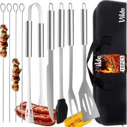 - Съдържание на комплекта (10 части): 1× шпатула 35 см, 1× щипки 34,5 см, 1× вилица 35 см, 1× нож 32 см, 1× силиконова четка 34 см, 4× шиш 35 см, 1× калъф.