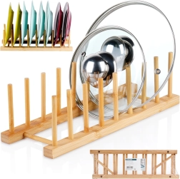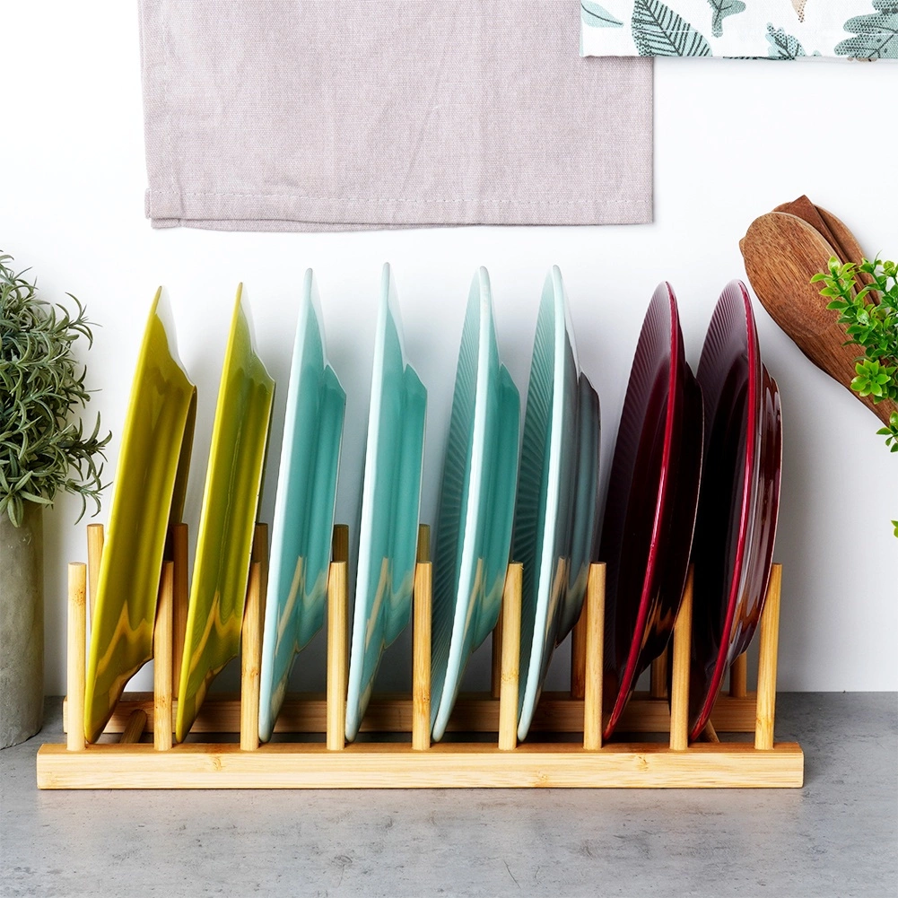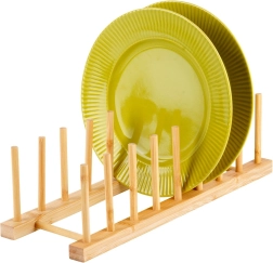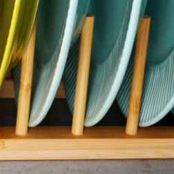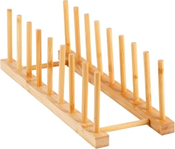 Тази универсална стойка от естествен бамбук помага да поддържате ред на кухненския плот, в чекмеджето и шкафа. Благодарение на премисленото разстояние между колчетата безопасно отделя капаци, плитки и по-дълбоки чинии (според профила им), както и дъски за рязане. Естественият материал с гладка повърхност защитава съдовете от надраскване и едновременно позволява добро циркулиране на въздуха.