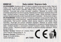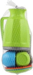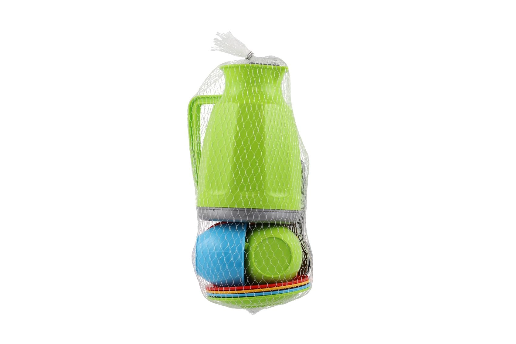 Комплектът съдържа всичко необходимо за малко чайно парти: чайник, чашки с чинийки и лъжички в весели цветове. Опакован в практична мрежичка, която улеснява съхранението и пренасянето. Подходящ от 12 месеца.