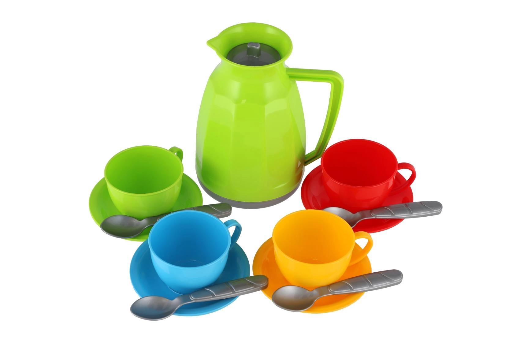 Очарователен детски чаен сервиз от лека пластмаса носи много забавление за малки домакини и домакини. Съдържа общо 13 части, включително чайник, чашки, чинийки и лъжички. Идеален за ролеви игри, развитие на въображението и споделено забавление. Благодарение на ярките цветове е привлекателен и безопасен за деца още от 12 месеца. Лек, цветен и издръжлив комплект в практична мрежичка за лесно пренасяне.