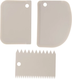 С този комплект от три шпакли постигате перфектно гладки стени и оригинални текстури върху торти, рула и сладкиши. Назъбените ръбове създават ефекти на вълни, райета или линии, а гладките шпакли осигуряват равномерно разнасяне на кремове и глазури. Благодарение на леката и здрава конструкция инструментите лежат отлично в ръка, а работата е бърза и прецизна.