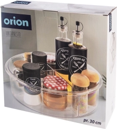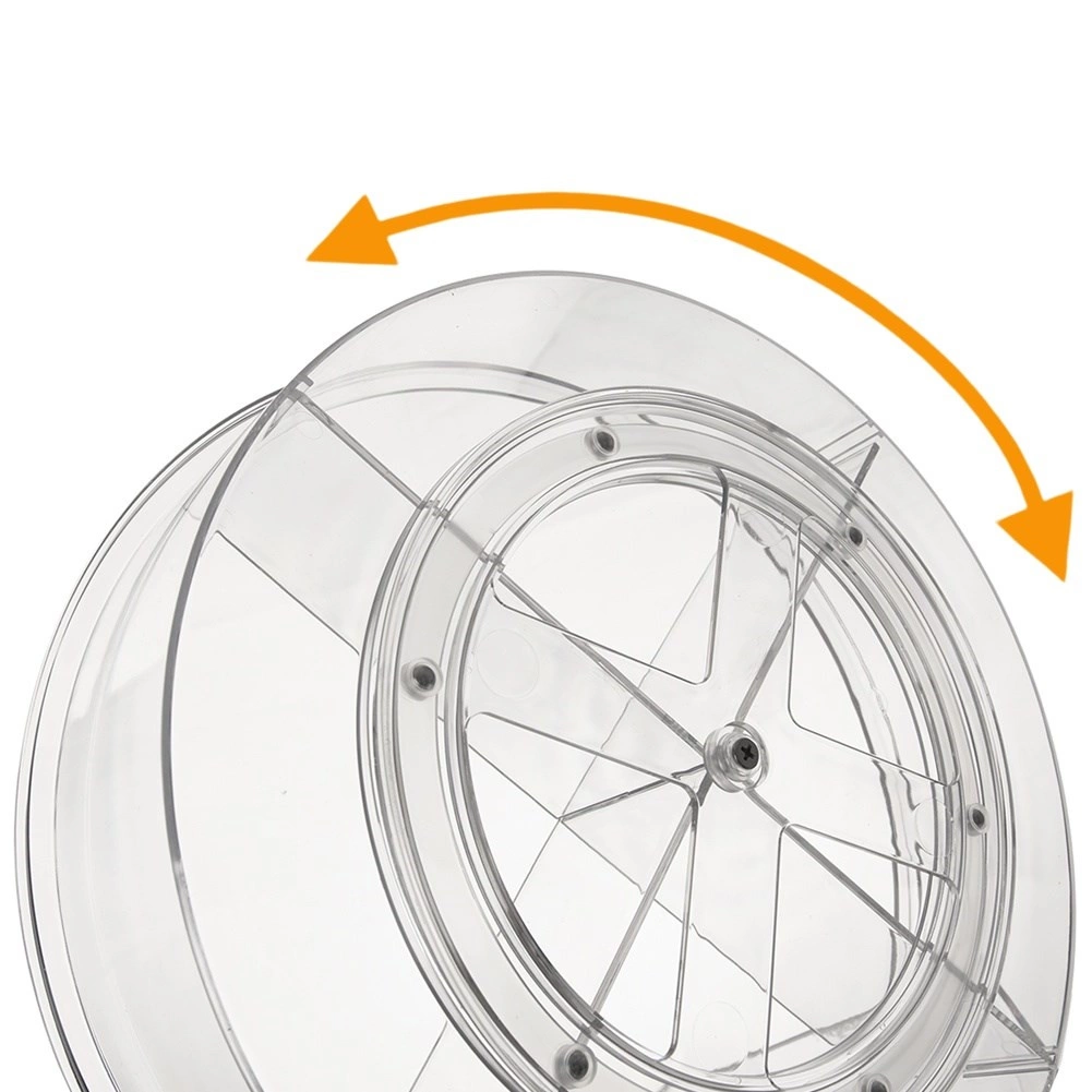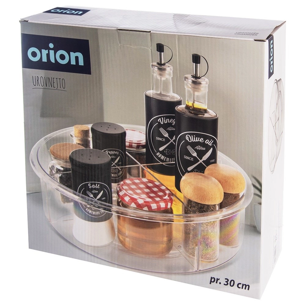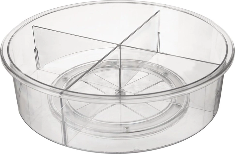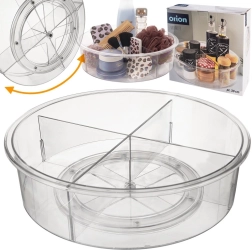 Практичен въртящ се органайзер с диаметър 30 см и височина 9 см внася ред в кухнята, банята и килера. Благодарение на основата с плавно движение се върти на 360°, така че всичко е бързо под ръка. Прозрачният дизайн и 4 отделни секции улесняват прегледното сортиране на подправки, козметика, бутилки и буркани, докато по-високите бордове предотвратяват изпадане при въртене.