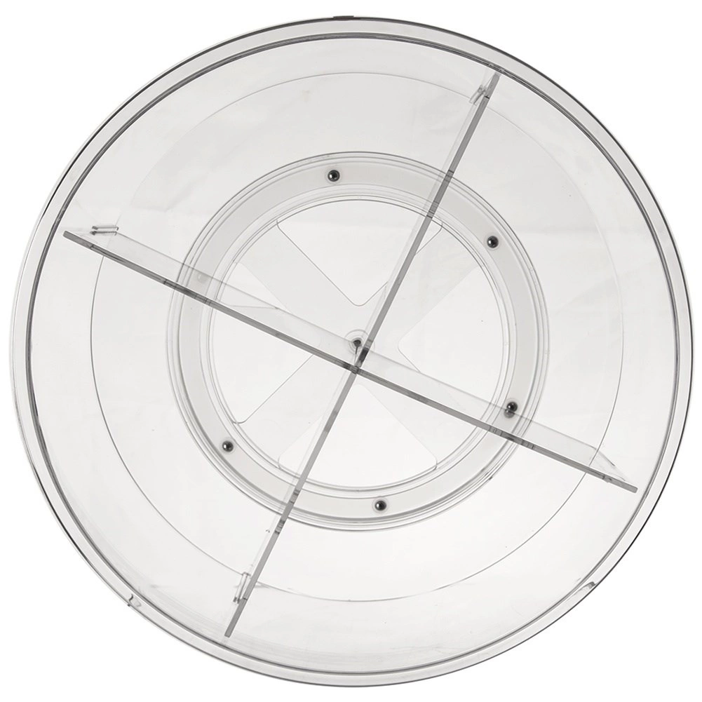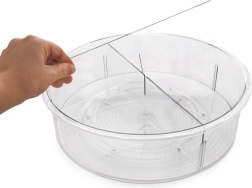 Максимизирайте използването на пространството по рафтовете, в хладилника или в шкафовете. Въртящият се органайзер благодарение на компактните размери и разделените прегради държи вещите ви подредени на едно място. Прозрачната пластмаса осигурява моментален преглед на съдържанието и лесно намиране.