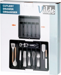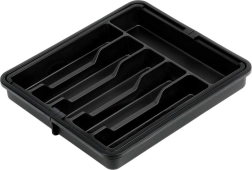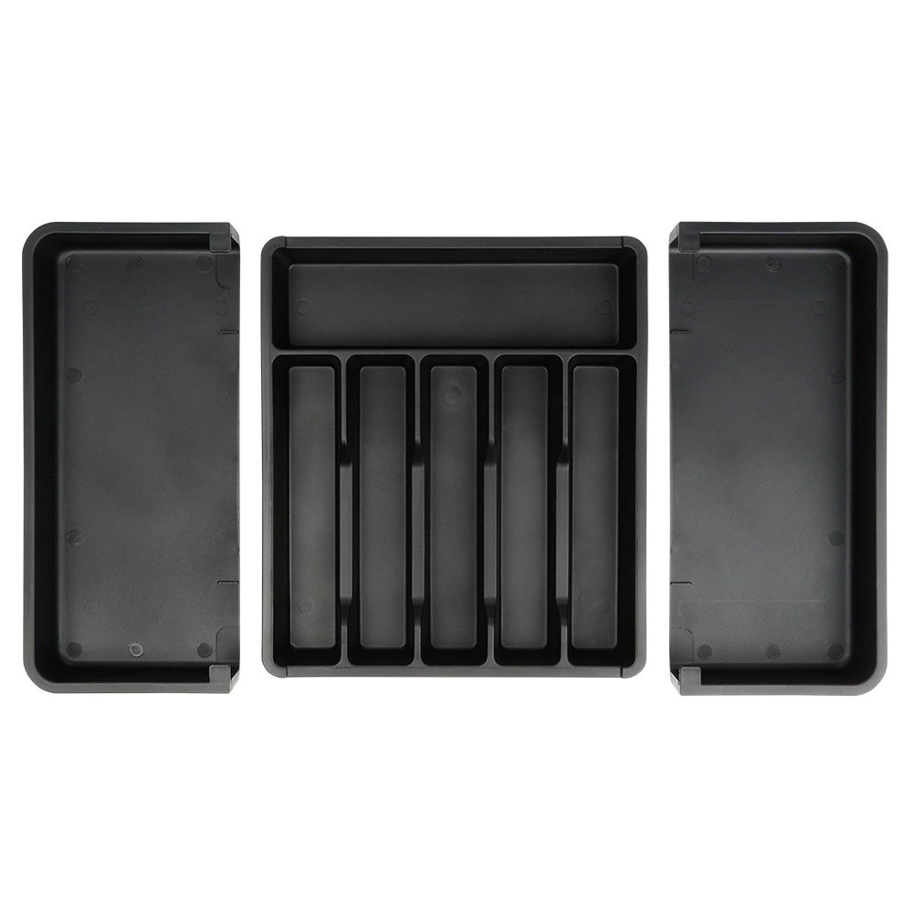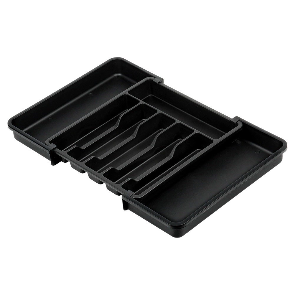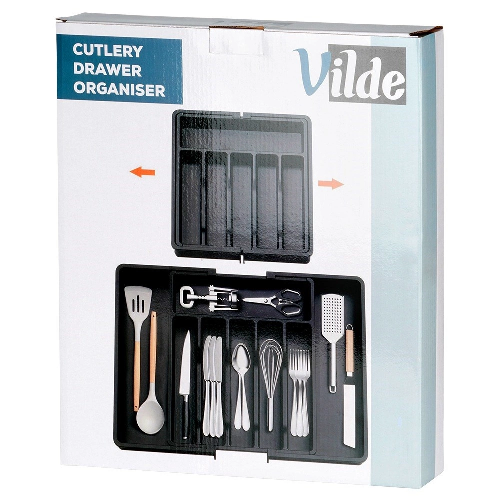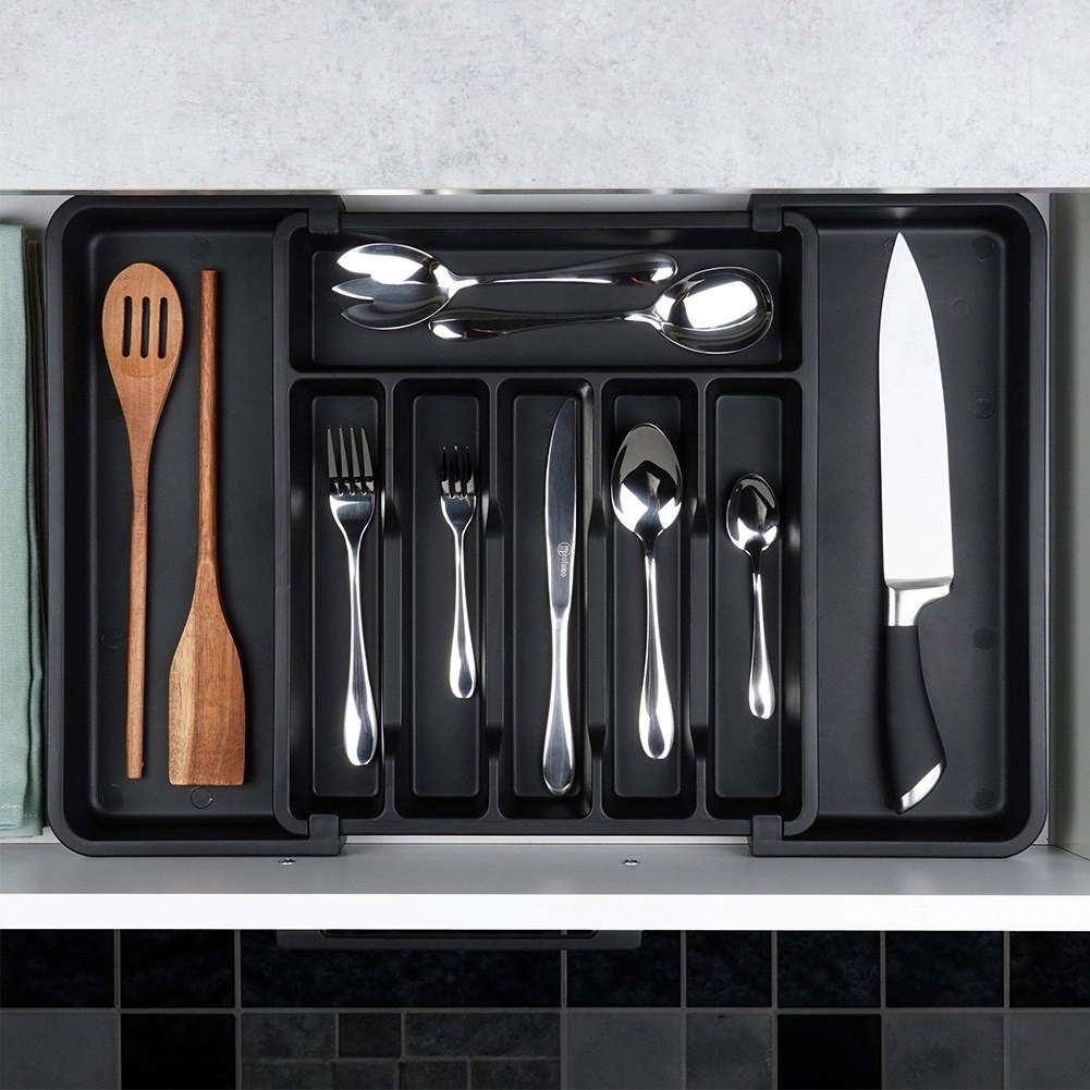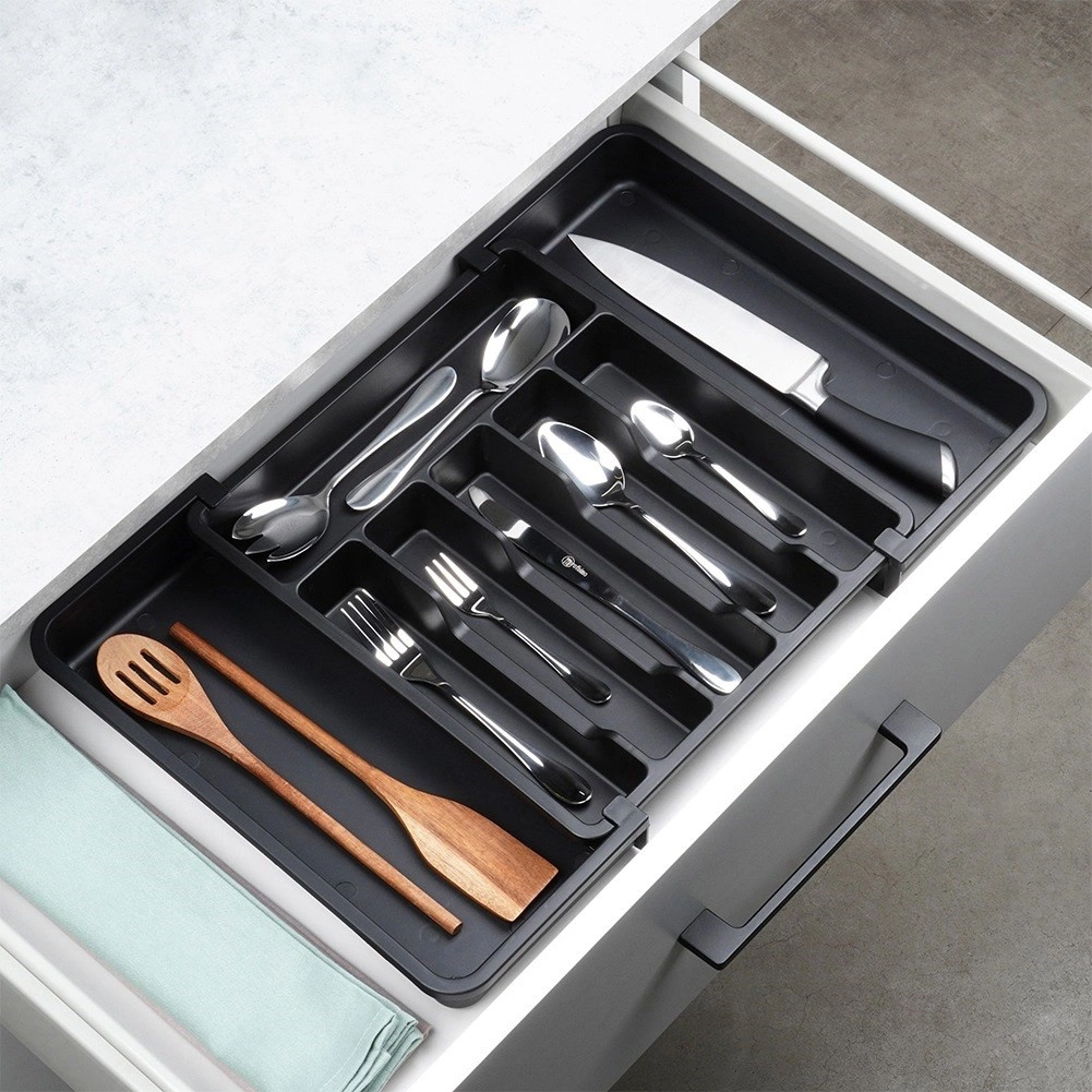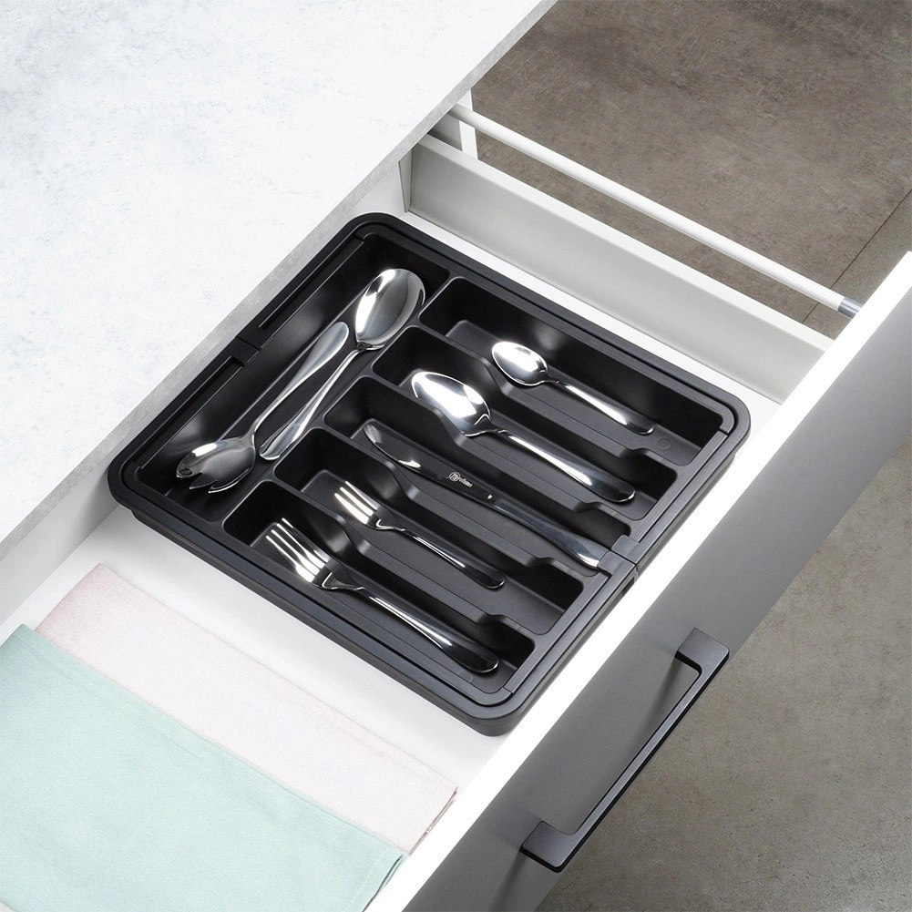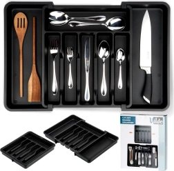 Практичният разтегаем органайзер за чекмедже поддържа вашите прибори и кухненски принадлежности винаги подредени и на мястото им. Благодарение на ширината, регулируема от 33 до 56,5 см, лесно се адаптира към повечето чекмеджета, има много отделения за ножове, вилици, лъжици и шпатули, и е изработен от издръжлива пластмаса в елегантен черен цвят за дълъг живот и лесно почистване.