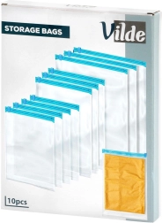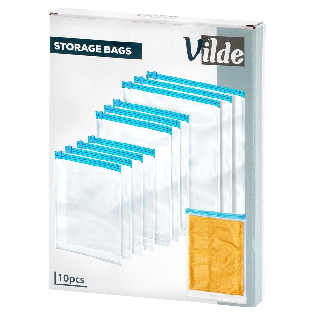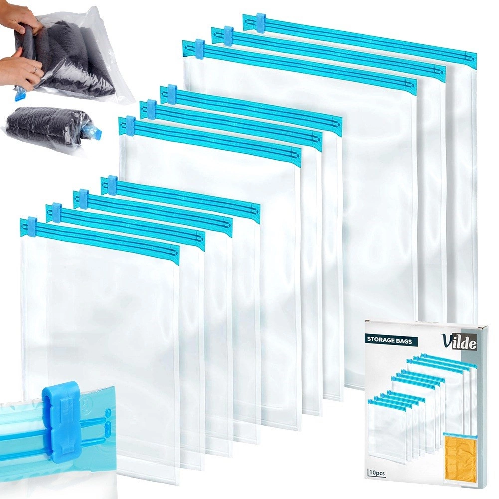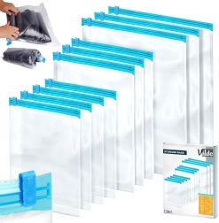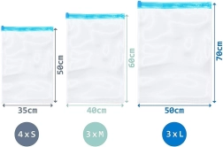 Комплектът съдържа 10 здрави компресиращи плика с надежден плъзгащ цип за многократна употреба. Благодарение на трите размера лесно съхранявате тениски, пуловери, якета и аксесоари както в куфара при пътуване, така и в гардероба у дома. Прозрачният материал позволява бърза проверка на съдържанието без отваряне.