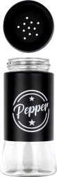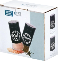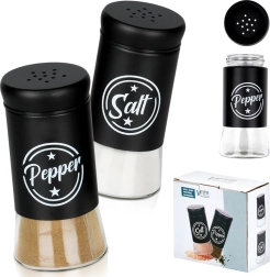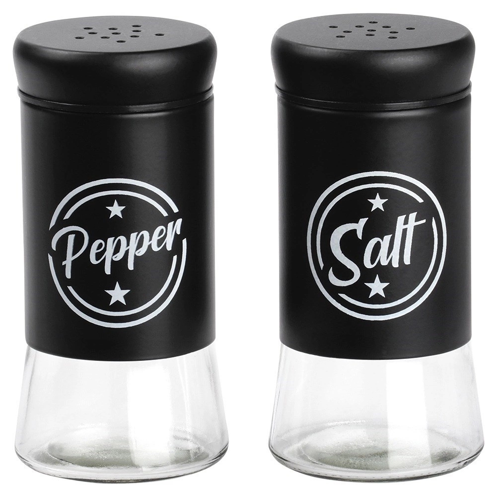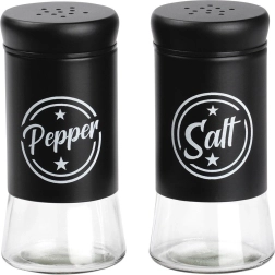 Комплектът съдържа две подправници с обем 140 ml с прозрачно стъклено дъно и матово черна метална горна част. Практичните капачки с отвори позволяват равномерно поръсване и помагат да се запазят свежестта и ароматът на подправките за по-дълго. Благодарение на ясните надписи Salt и Pepper винаги бързо ще разпознаете правилната подправница.