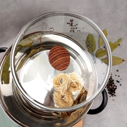 Универсален стъклен капак с диаметър 24 см със здрава неръждаема рамка, удобна дръжка с дървесен вид и вентилационен отвор. Благодарение на термоустойчивото стъкло виждате как се готви без да повдигате капака, храната се приготвя по-бързо, а кухнята остава без излишно пръскане.