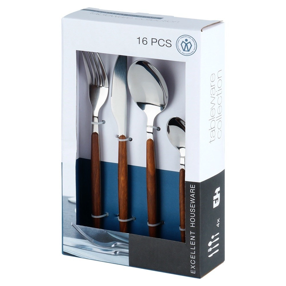 Елегантен комплект прибори за 4 души от висококачествена неръждаема стомана с лъскава повърхност, допълнен с ергономични дръжки с дървесен декор. В комплекта ще откриете 16 части за ежедневна употреба и празнична трапеза. Приборите са издръжливи, удобни за захват и могат да се мият в съдомиялна.