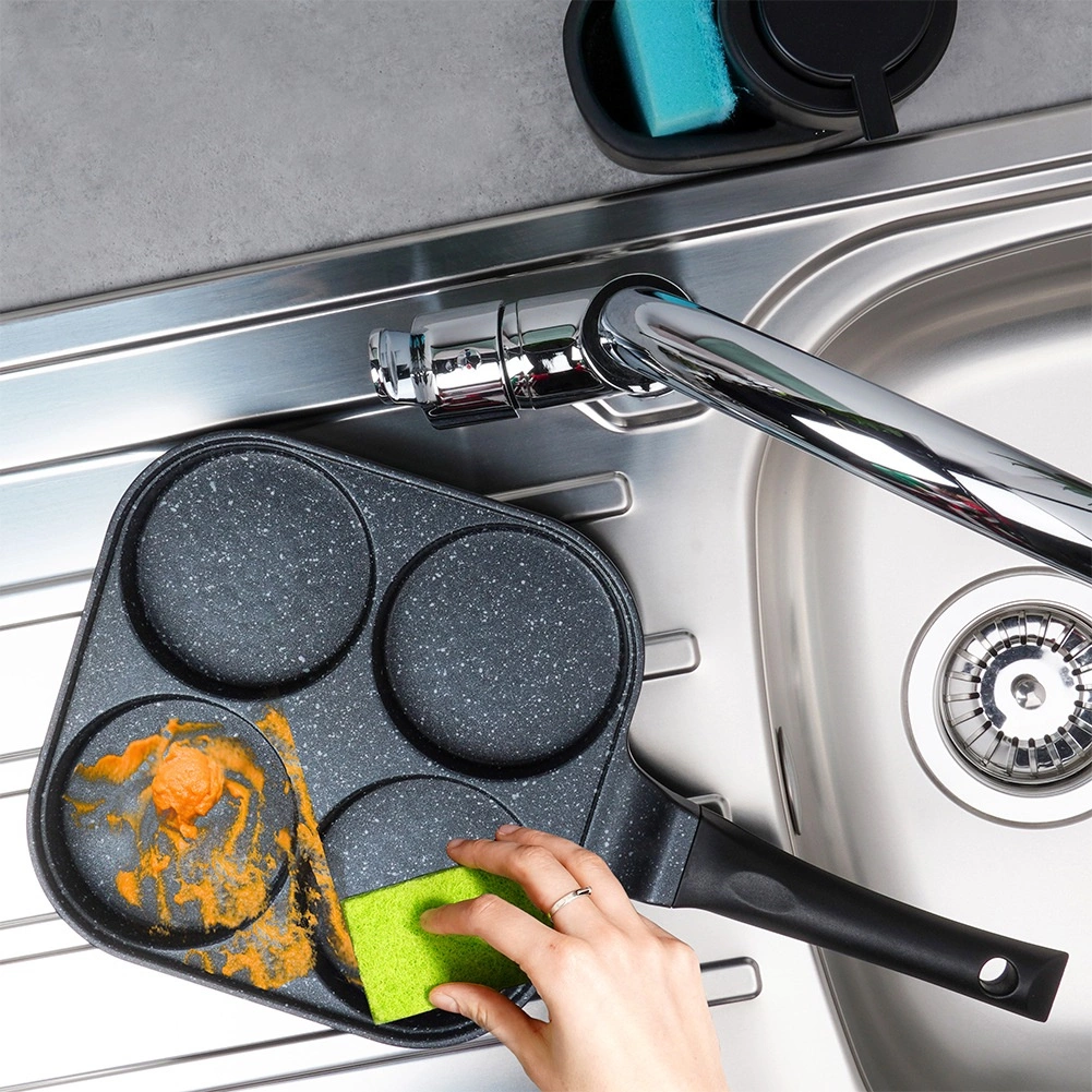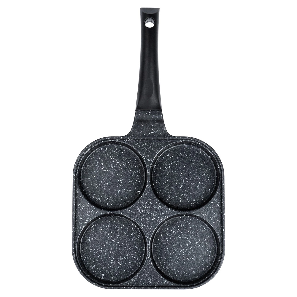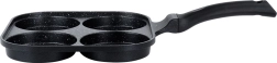 Квадратният тиган 22 × 22 см с четири отделни камери осигурява еднакъв размер на порциите и перфектен вид на закуската. Алуминиевото тяло с гранитно незалепващо покритие се загрява бързо и отлично разпределя топлината, така че пържите бързо, икономично и без загаряне. Ергономичната, противоплъзгаща дръжка с отвор за закачване гарантира удобно и безопасно използване.