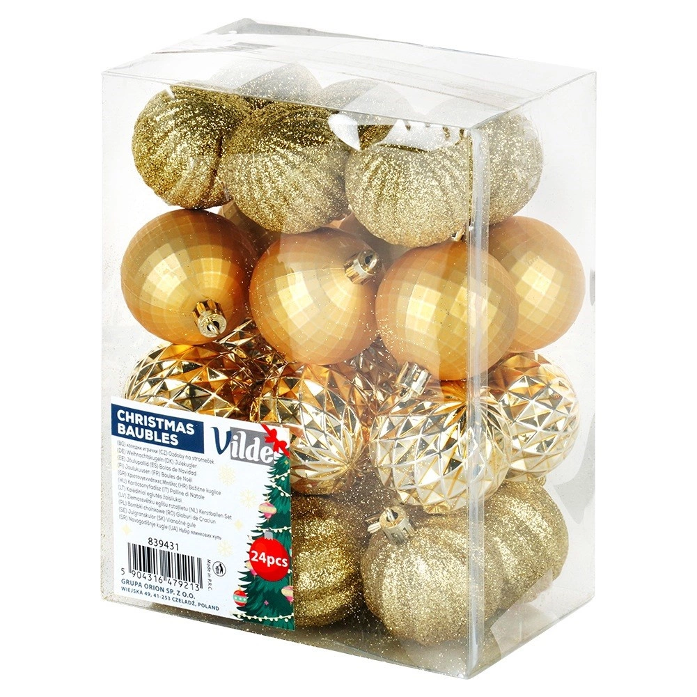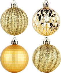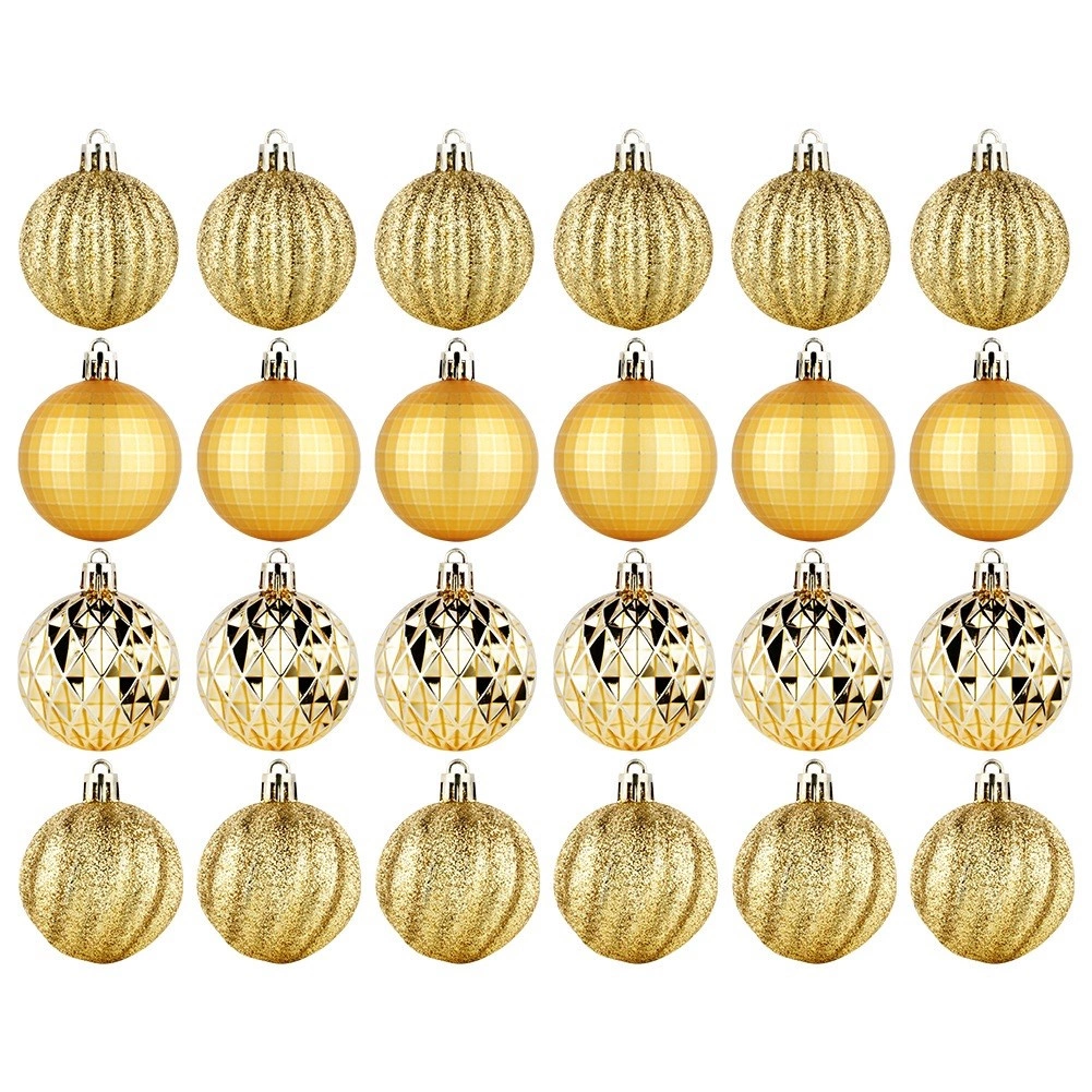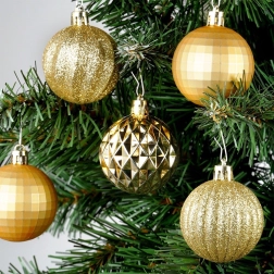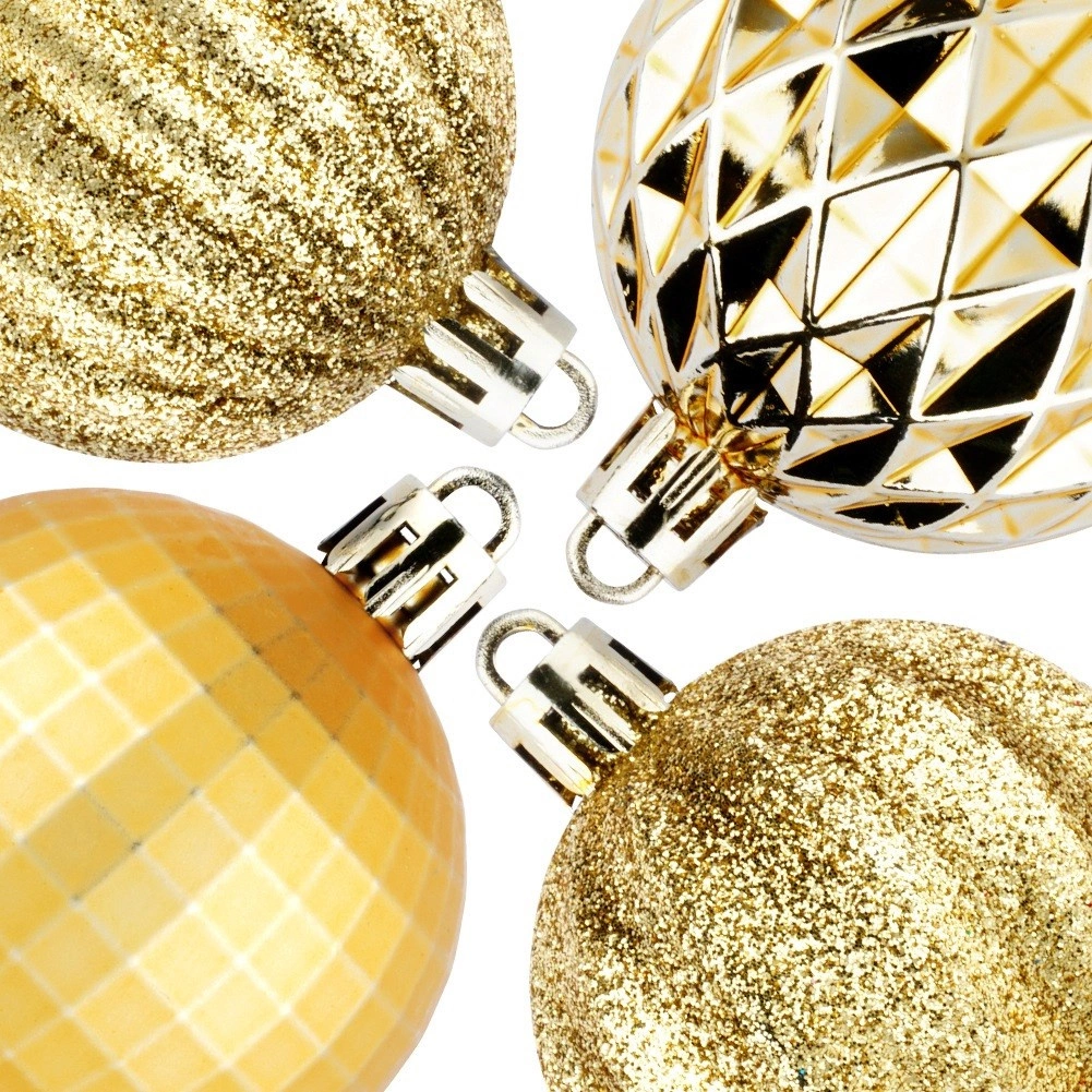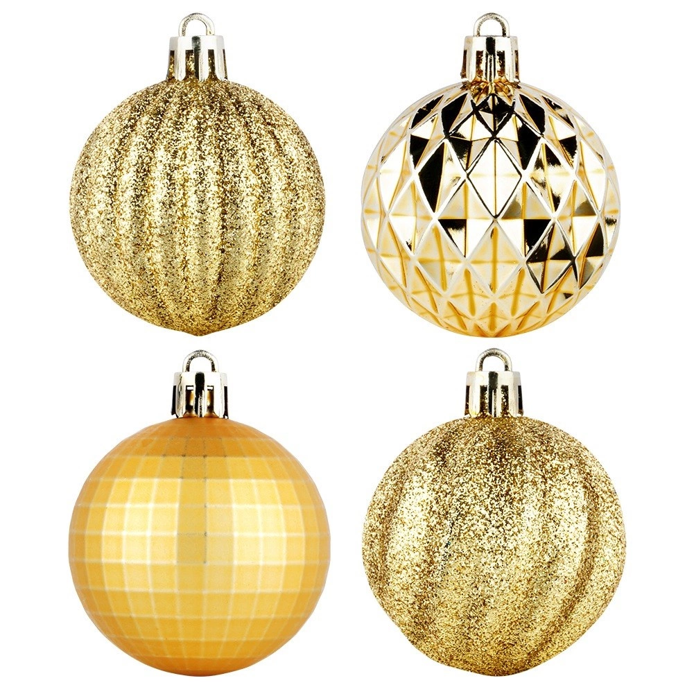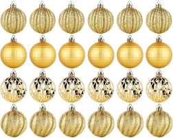 Елегантен комплект от 24 златни коледни топки с диаметър 5 см в различни повърхностни покрития – лъскави, матови, брокатени и структурирани. Изработени от нечуплива пластмаса за по-голяма безопасност в дома с деца и домашни любимци, с включени връвчици за лесно окачване.