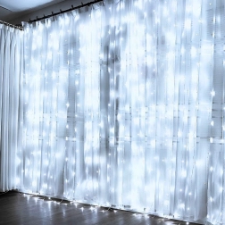 Създайте вълшебна атмосфера със светлинна завеса с размери 3 × 3 m и общо 300 LED в студено бяло. Лесно окачване благодарение на вградените куки, USB захранване и удобно дистанционно управление с 8 светлинни режима, димиране и таймер я правят идеална декорация за прозорци и стени. Подходяща за интериор.