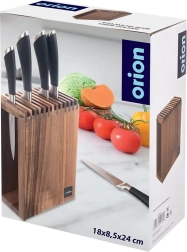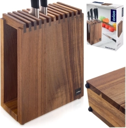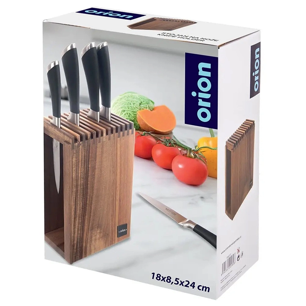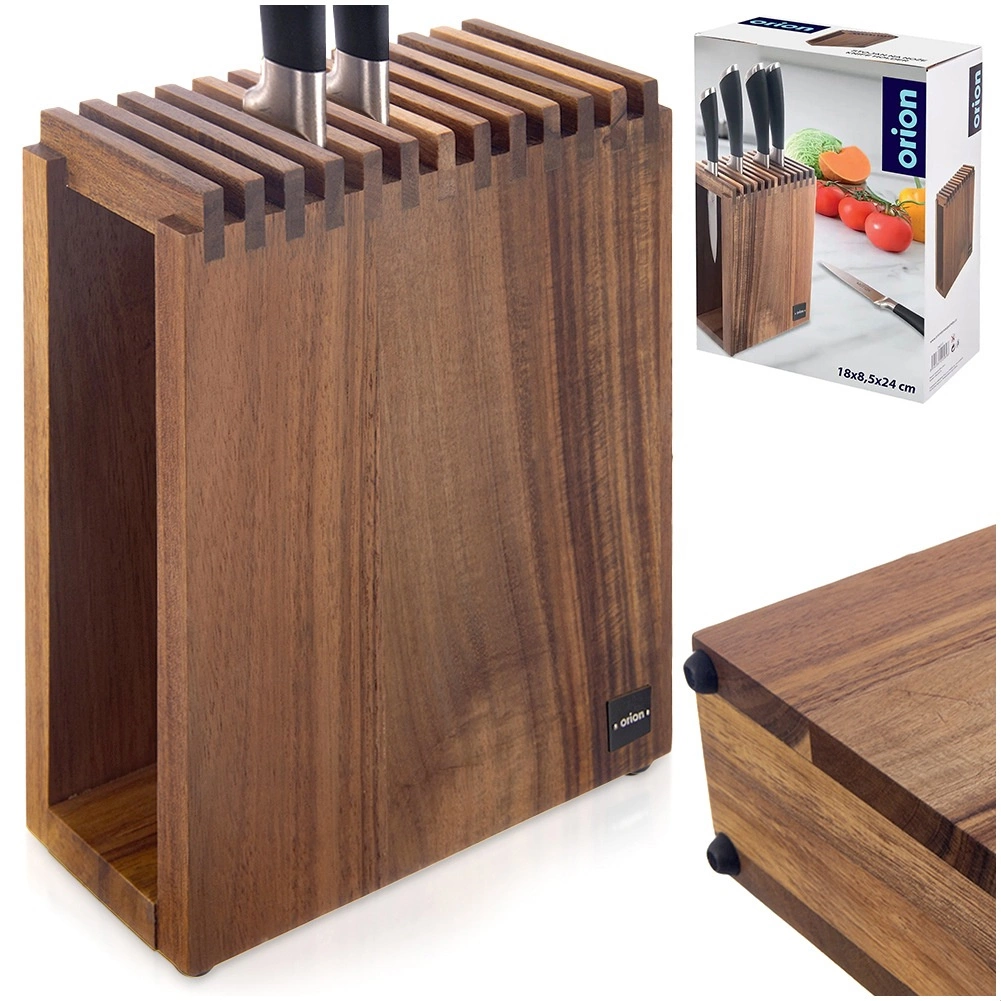 Разпределението на слотовете позволява универсално съхранение на ножове от различни материали (стомана, керамика и комбинирани), включително кухненски ножици. Неплъзгащите крачета предотвратяват приплъзването и защитават работната повърхност от надраскване. Благодарение на компактните размери не заема излишно място, а въпреки това побира голям брой инструменти.
