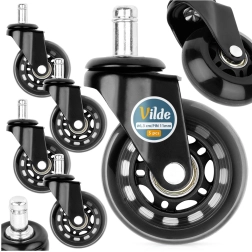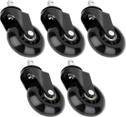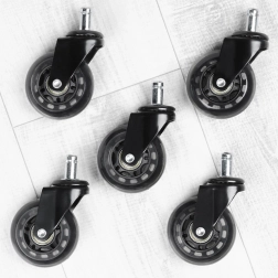 Подобрете своя офис стол с комплект от 5 каучукови колелца, които гарантират тихо и плавно придвижване по всички твърди подови настилки. Благодарение на устойчивия материал колелцата са издръжливи на износване и щадящи към повърхностите, така че не е нужно да се притеснявате от драскотини у дома или в офиса.