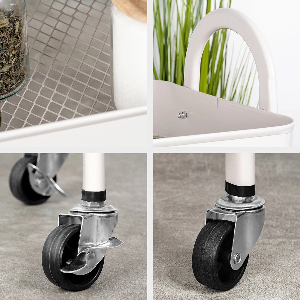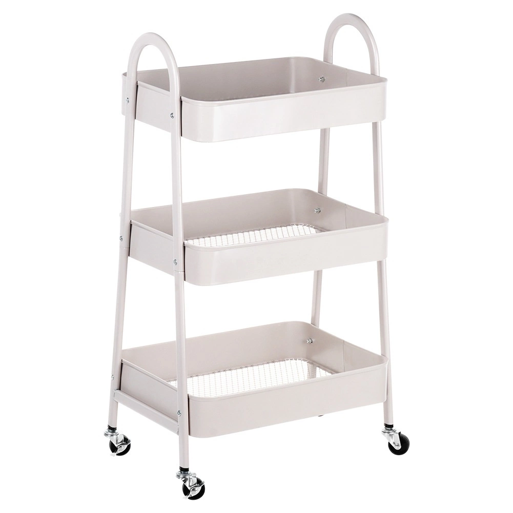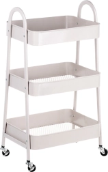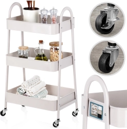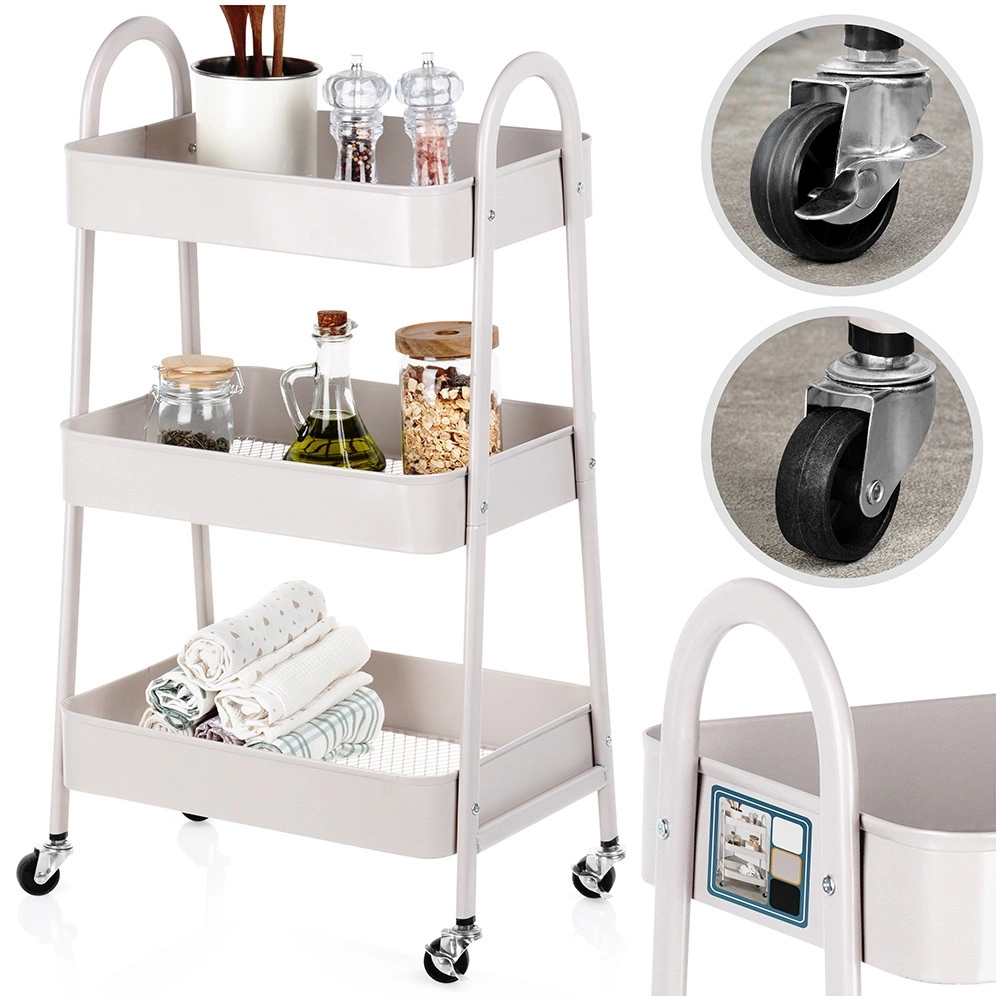 Практична и стилна подвижна етажерка с три просторни рафта предлага умно решение за организация на дома. Благодарение на компактните размери 44 × 31,5 × 78,5 см се побира и в по-малки пространства, като същевременно осигурява голям капацитет. Стабилната метална конструкция в бежов цвят и 4 колелца (2 с спирачка) гарантират лесно преместване и безопасно стоене. Идеална за кухня, баня, офис и работилница.