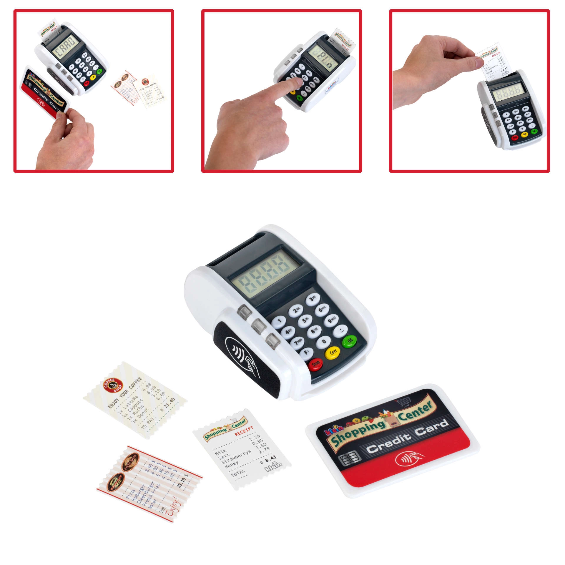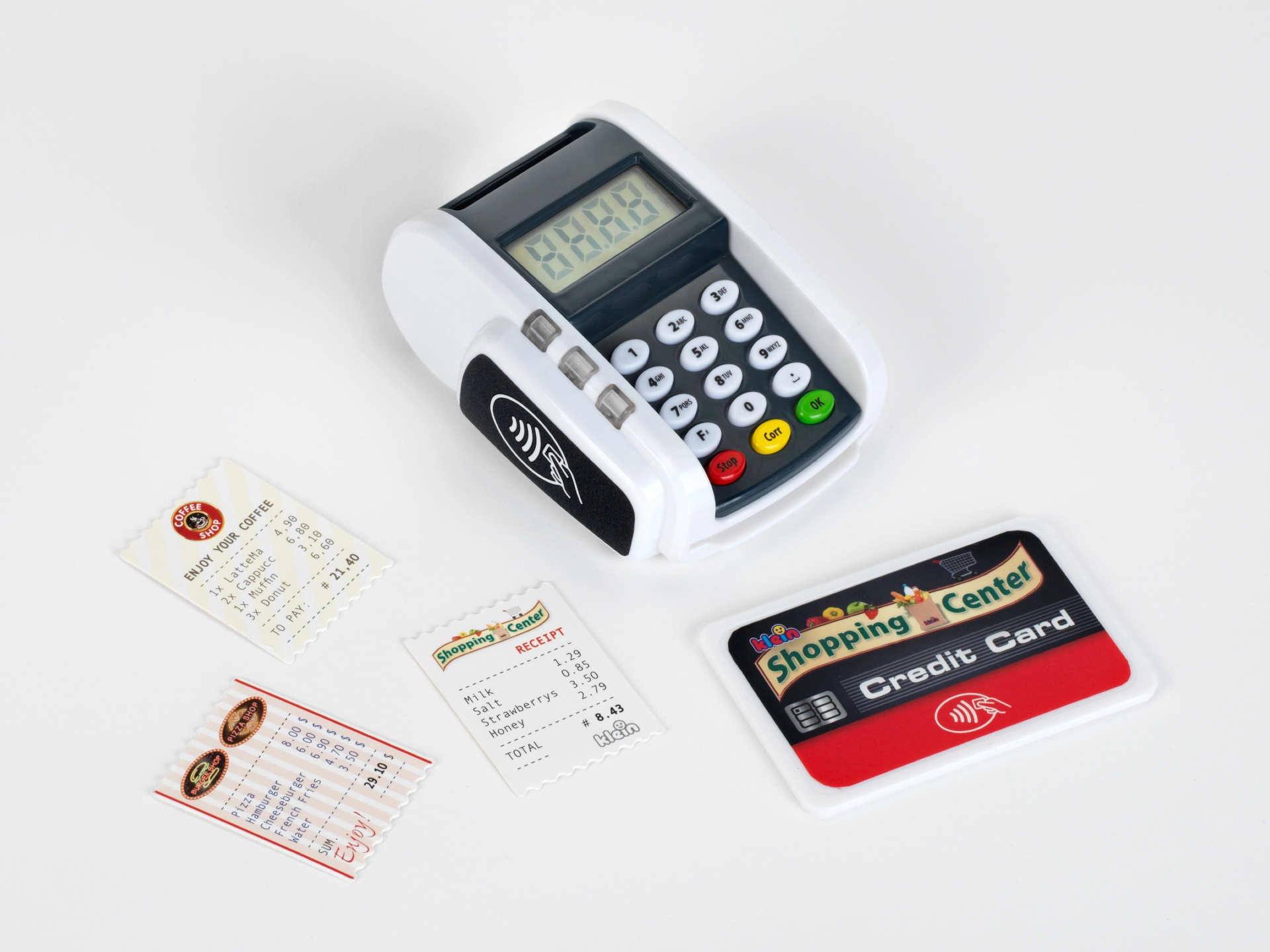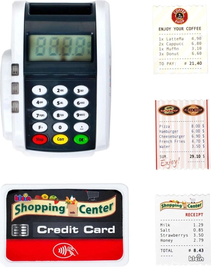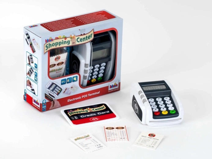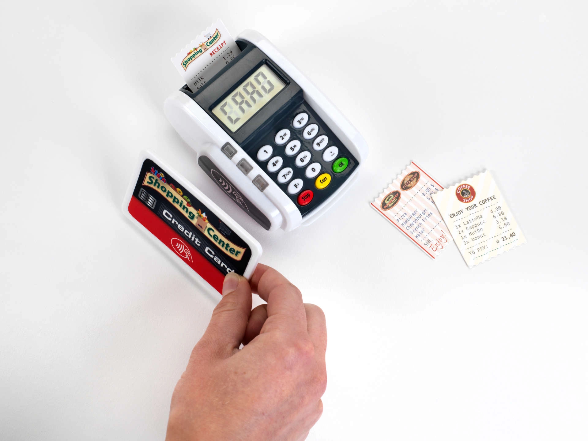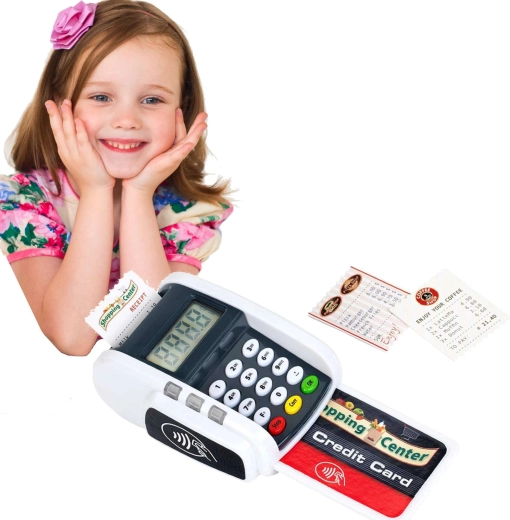 Този компактен терминал правдоподобно имитира истинско устройство: децата могат да натискат цифровата клавиатура, да доближават платежна карта и да „печатат“ касови бележки за по-реалистична игра на каса. Светлинните и звуковите ефекти придават на всяка транзакция необходимия реалистичен нюанс и подпомагат развитието на социалните умения.