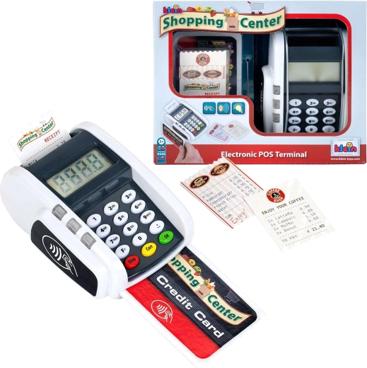 Реалистичният детски платежен терминал на марката KLEIN носи забавление като на каса. Предлага функционални бутони, четец за безконтактни плащания, светлинни и звукови ефекти и позволява на децата по забавен начин да развиват въображението си, играейки на магазин или ресторант.