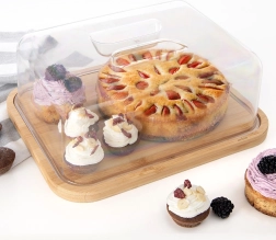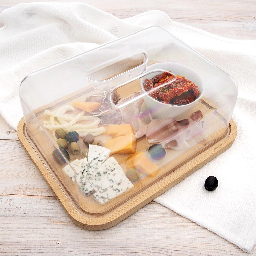 Елегантна бамбукова сервираща дъска с прозрачен похлупак, която надеждно предпазва храната и едновременно я представя стилно. Идеална за сирена, колбаси, десерти и плодове. Издръжливият бамбуков поднос с практичен капак с дръжка запазва ястията по-дълго свежи и защитени от прах и насекоми – отлично решение за домашна трапеза и градински събирания.
