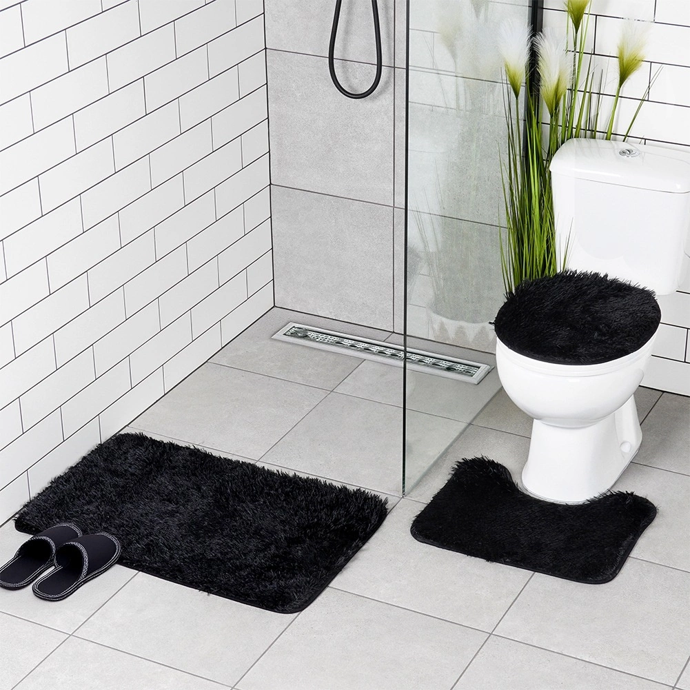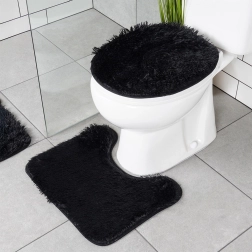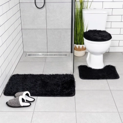 Елегантен комплект от три постелки за баня в черен цвят за ежедневен комфорт и безопасност. Включва правоъгълна постелка, U-изрязана постелка за тоалетната и калъф за капака на тоалетната. Меко, пухкаво полиестерно влакно приятно затопля, докато несплъзгащата долна страна осигурява стабилност върху пода. Постелките са перящи се до 30 °C и чудесно допълват модерни и класически бани.