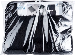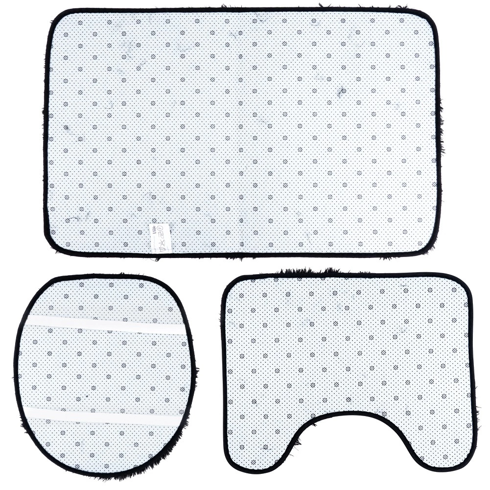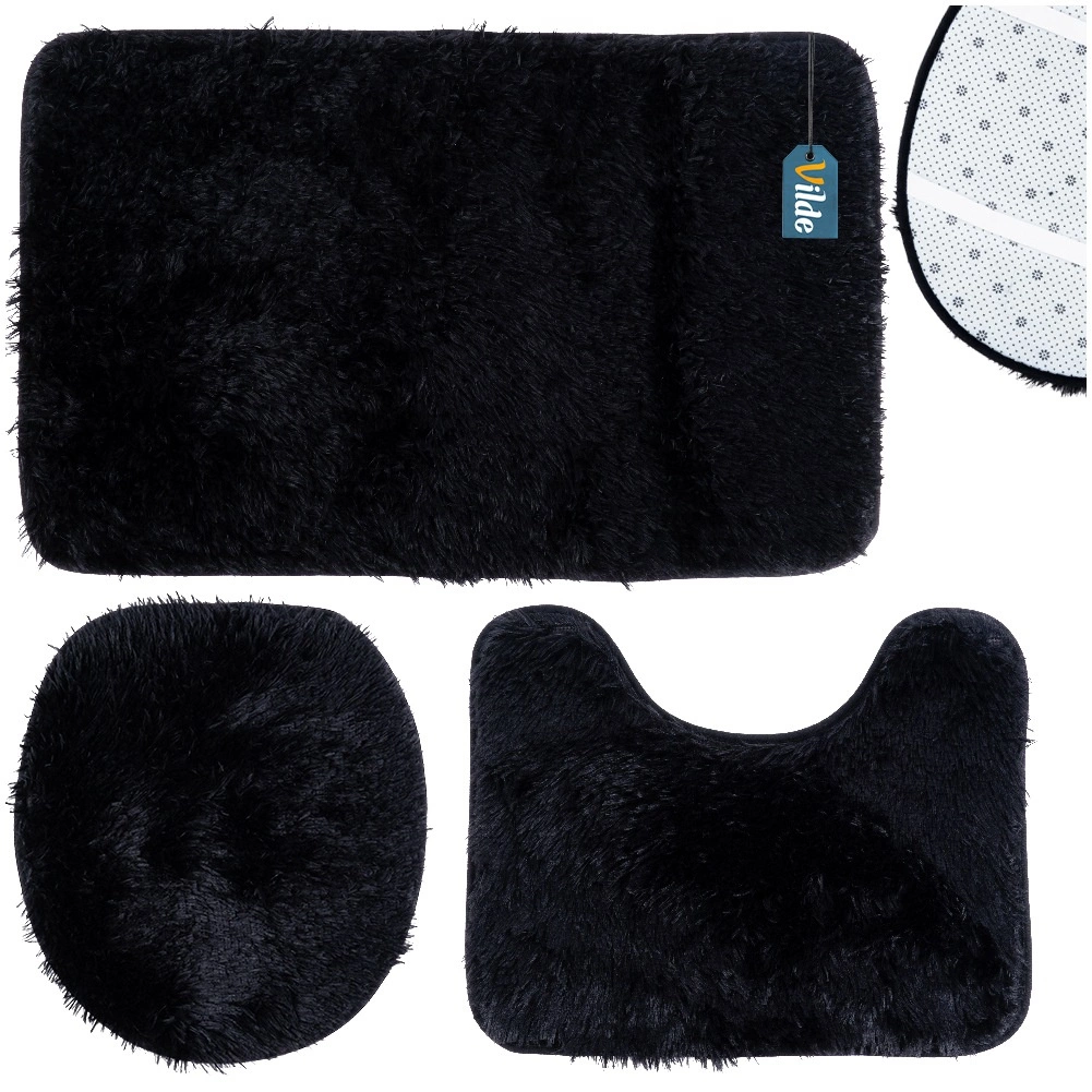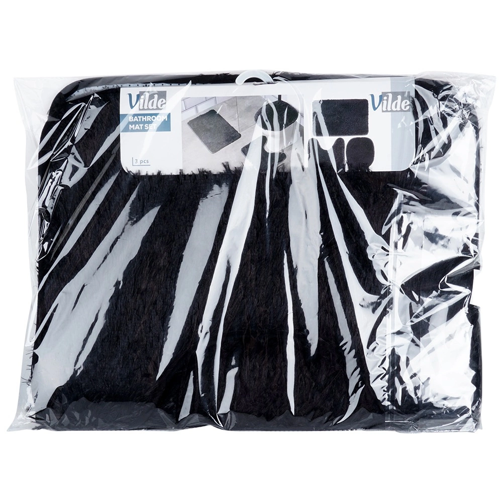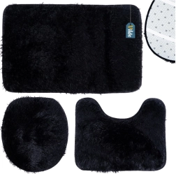 Комплектът включва правоъгълна постелка за ваната или душа, U-изрез към основата на тоалетната за чисто и удобно пространство около тоалетната и калъф за капака на тоалетната с ластици за сигурно закрепване. Минималистичният черен цвят пасва на всеки интериор и подчертава дизайна на банята.