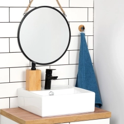 Кръглата бамбукова основа в комбинация с черен метален пин придава на интериора модерен, елегантен акцент и чудесно подхожда както на банята, така и на кухнята.