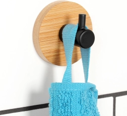 Елегантна кука с кръгла бамбукова подложка и матово черен метален щифт, подходяща за модерни и естествени интериори. Осигурява практично място за закачане на хавлии, дрехи или чанти, без да се налага да пробивате стена. Благодарение на качествените материали е издръжлива и дълготрайно надеждна.