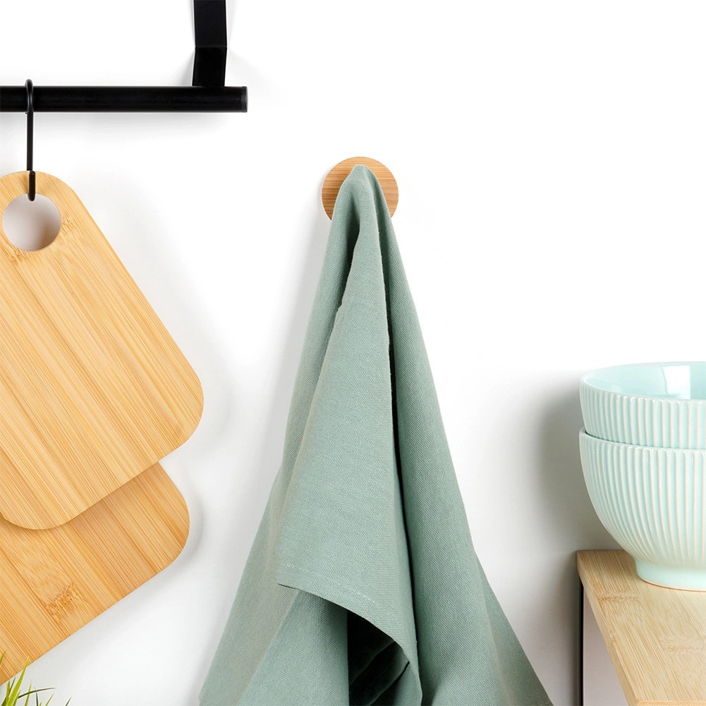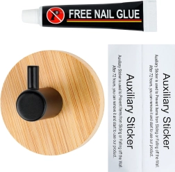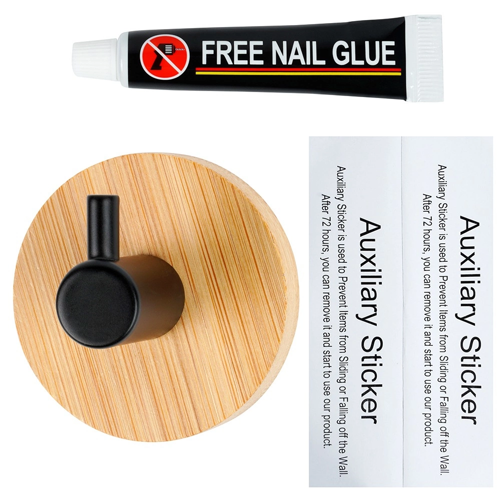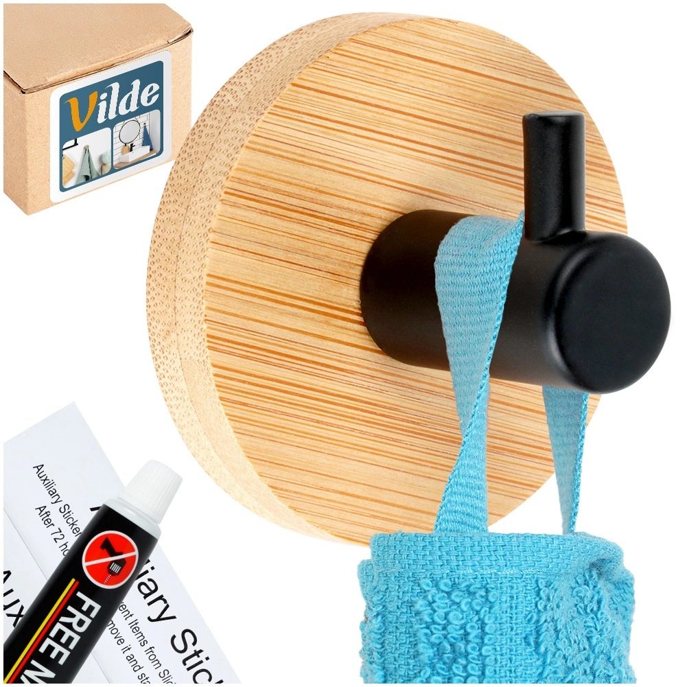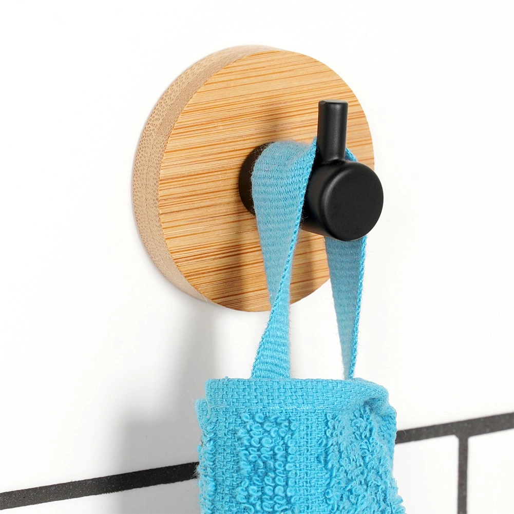 Стилна стенна кука с бамбукова основа и черен метален пин за ежедневна употреба в банята, кухнята и антрето. Монтаж без пробиване с помощта на лепило и самозалепващи стикери осигурява здраво и трайно закрепване. Компактни размери 5 × 3,5 см, модерен дизайн и универсално приложение за хавлии, кърпи, халати или аксесоари.