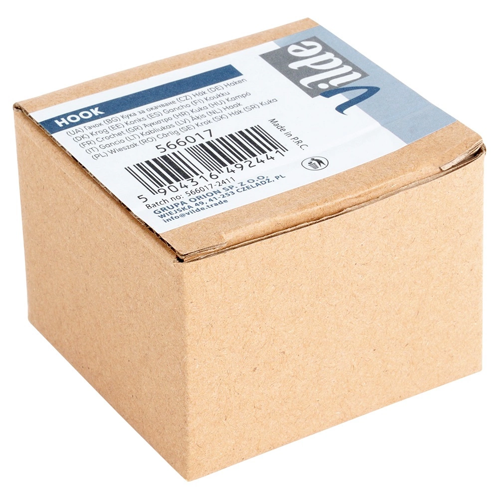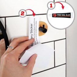 Инсталацията е бърза и чиста: куката се закрепва с включеното лепило и помощните стикери. За най-добър резултат преди монтажа почистете и обезмаслете старателно повърхността и оставете лепилото да втвърди около 72 часа преди първото натоварване.