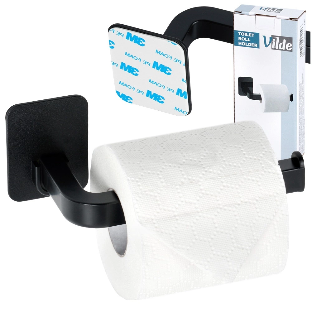 Елегантен държач за тоалетна хартия в черен цвят с самозалепващ монтаж 3M без пробиване. Компактни размери 16,5 × 7 × 6,5 см, модерен минималистичен дизайн, лесна смяна на ролката и надеждно закрепване върху гладки повърхности.