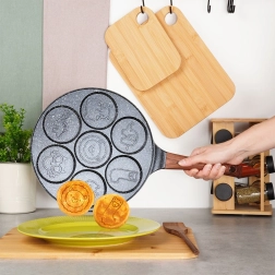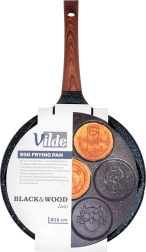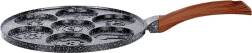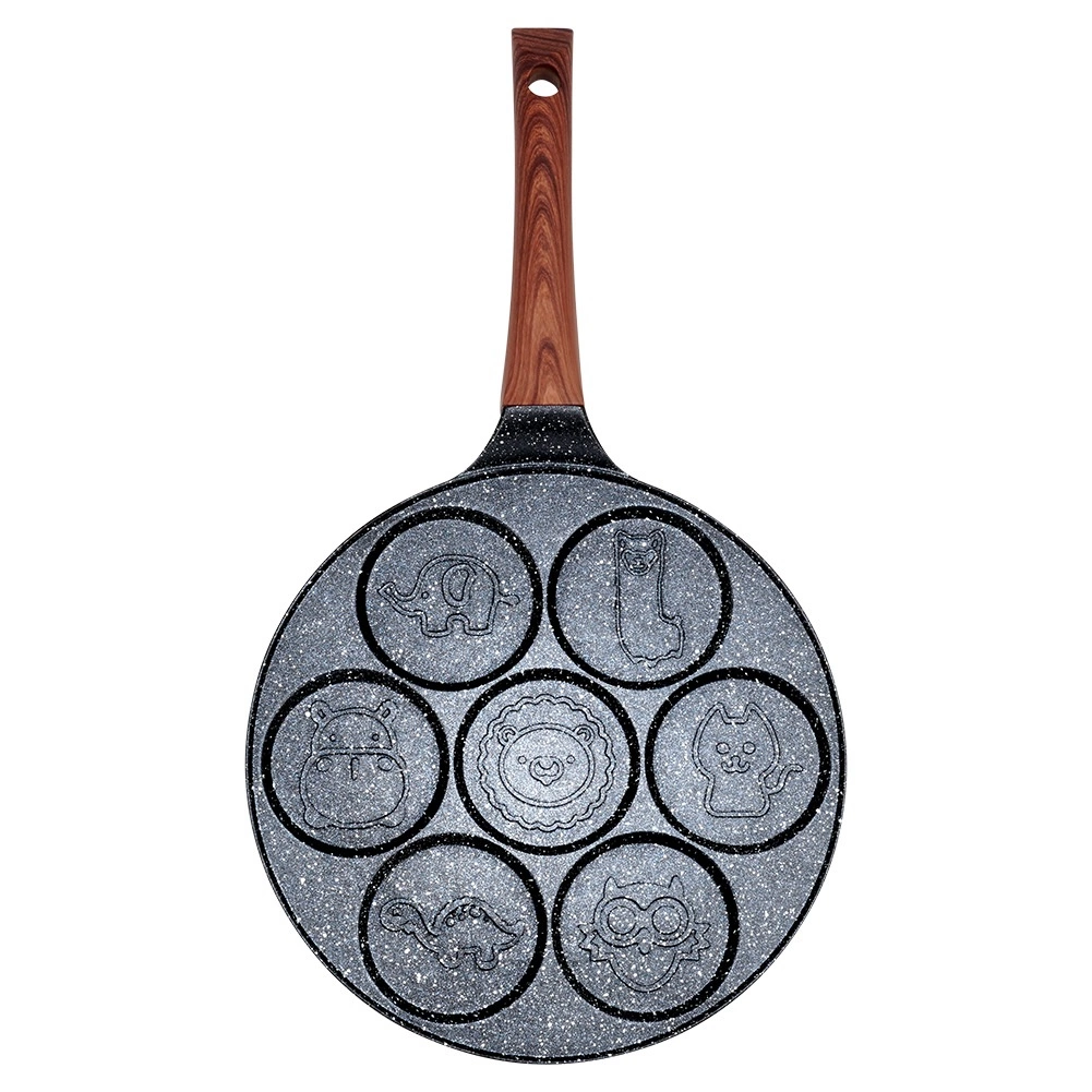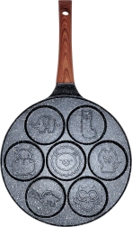 Този стилен тиган от линията BLACK & WOOD е идеален за яйца, палачинки и мини палачинки. Седемте кръгли вдлъбнатини с игриви релефи на животни оформят красиви, еднакви форми и внасят радост във всяка закуска. Здравата алуминиева конструкция с гранитно покритие осигурява бързо загряване и дълъг живот.