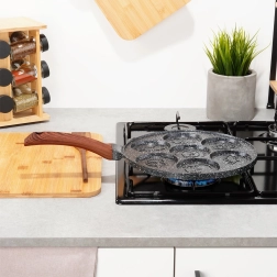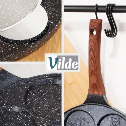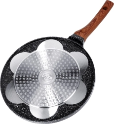 Практичен гранитен тиган за яйца и палачинки с диаметър 26 см и 7 форми с диаметър 8 см за идеално кръгла форма. Непролепващо покритие позволява готвене с минимум мазнина, равномерно разпределение на топлината пести време и енергия, а дръжката Soft Touch осигурява удобен и безопасен захват. Подходящ за всички видове котлони, включително индукция, и за миялна машина.