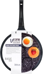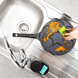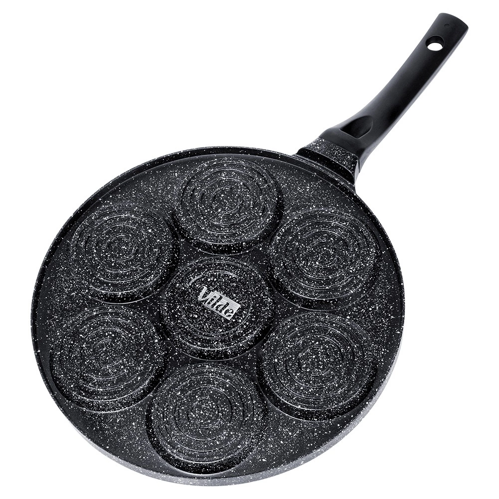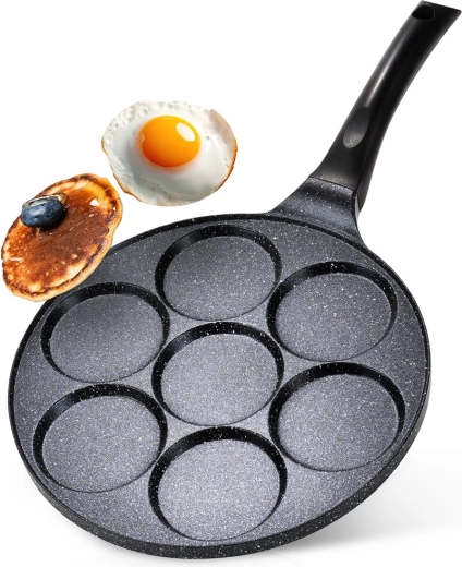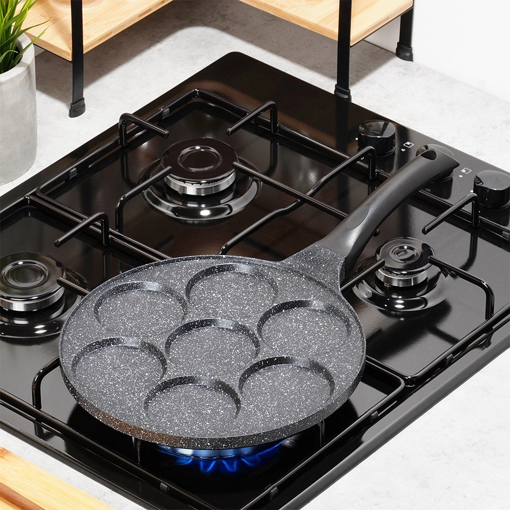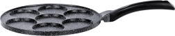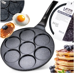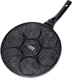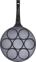 Практичен гранитен тиган със 7 кръгли отвора (Ø 8 см) за перфектно оформени яйца, палачинки тип „ливънци“ и мини палачинки. Леко алуминиево тяло с незалепващо покритие за готвене с минимум мазнина, равномерно разпределение на топлината и ергономична дръжка с ухо за окачване. Подходящ за газови, електрически и керамични котлони и за съдомиялна машина.