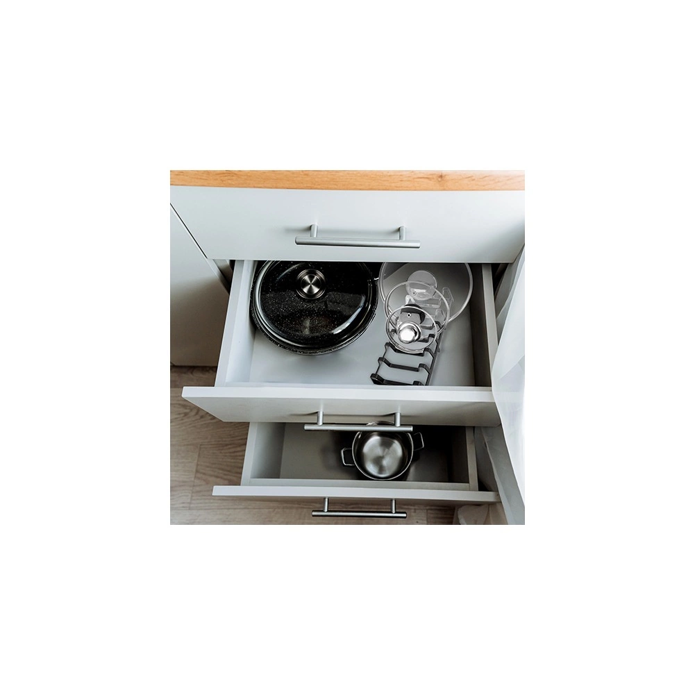 Край на разпилените капаци и чинии. Тази универсална стойка 30 × 14 × 6 cm държи всичко на място и прегледно разделено. Благодарение на компактните размери е подходяща за работния плот, шкаф или дълбоки чекмеджета. Черният дизайн лесно се вписва във всяка кухня.