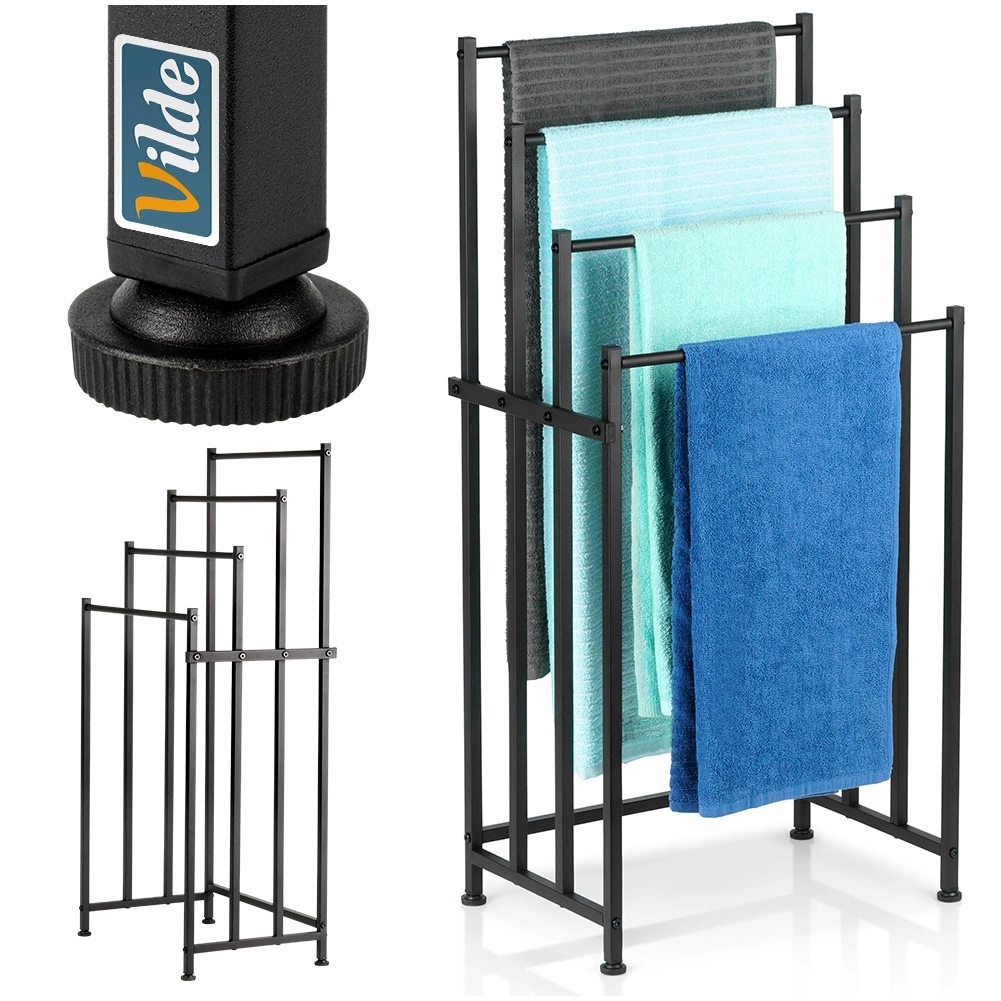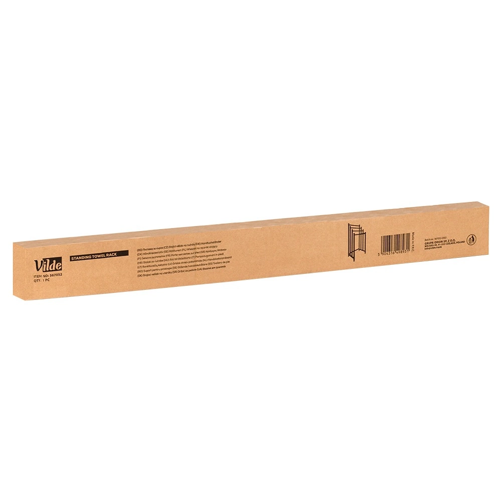 Свободностоящата метална закачалка за кърпи Vilde е практично решение за всяка баня. Четирите здрави пръчки позволяват да се разположат повече кърпи на няколко нива за по-бързо изсъхване и по-добра циркулация на въздуха. Прахово боядисаният метал в елегантно черно придава на интериора модерен лофт характер.
