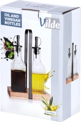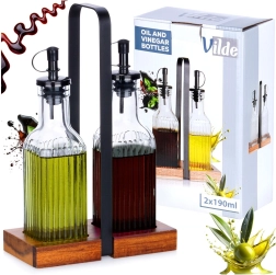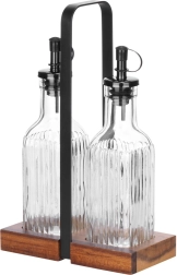 Елегантен комплект от два стъклени дозатора за олио и оцет в стабилна стойка, който комбинира функционалност и стил. Рифелованото стъкло подчертава съдържанието, прецизното дозиране е гарантирано от практичните наливки, а здравата дървена основа с метална дръжка улеснява пренасянето и сервирането. Идеален за дома и гастрономията.