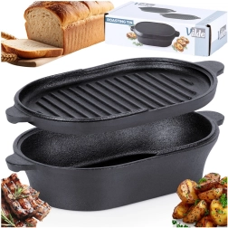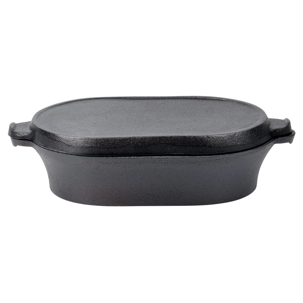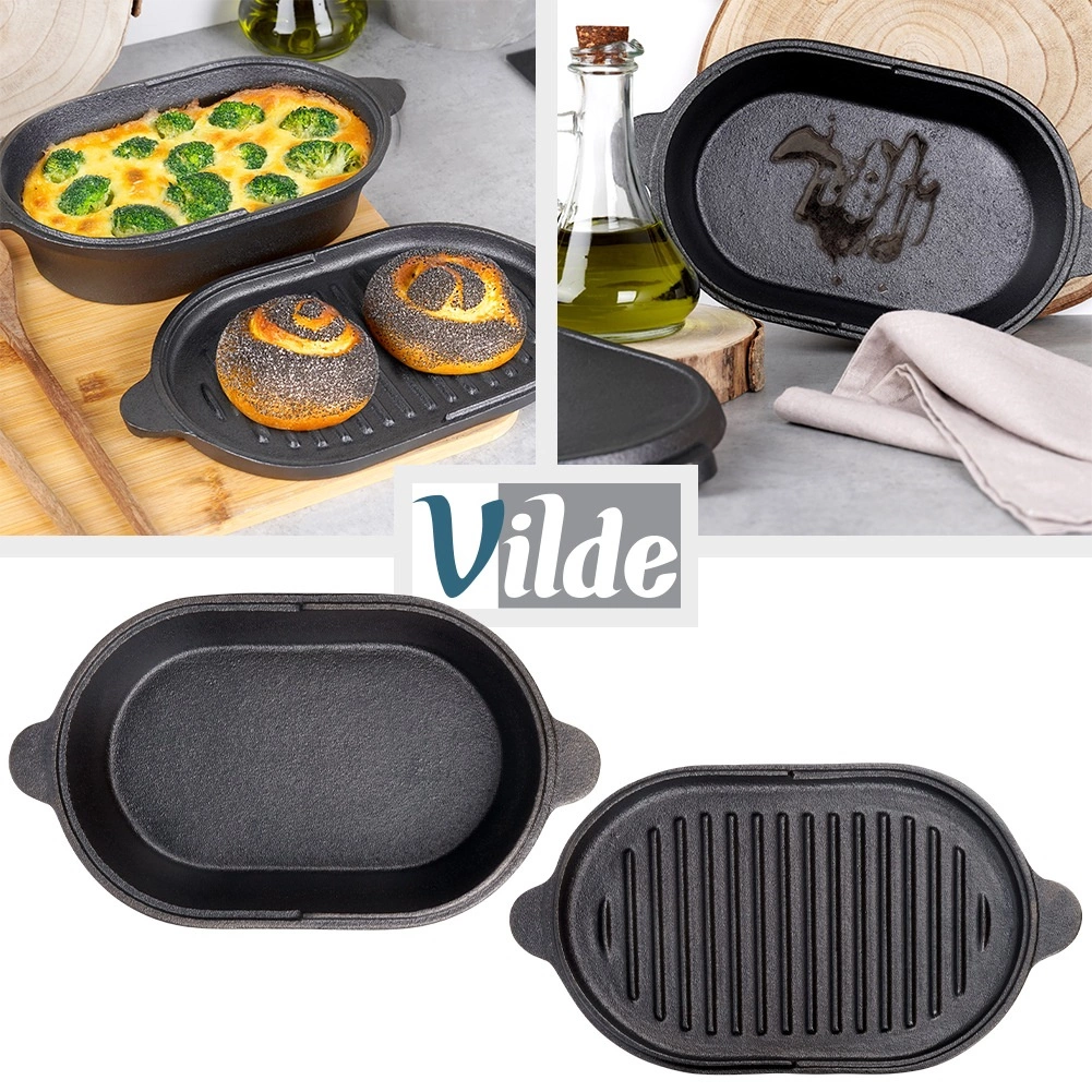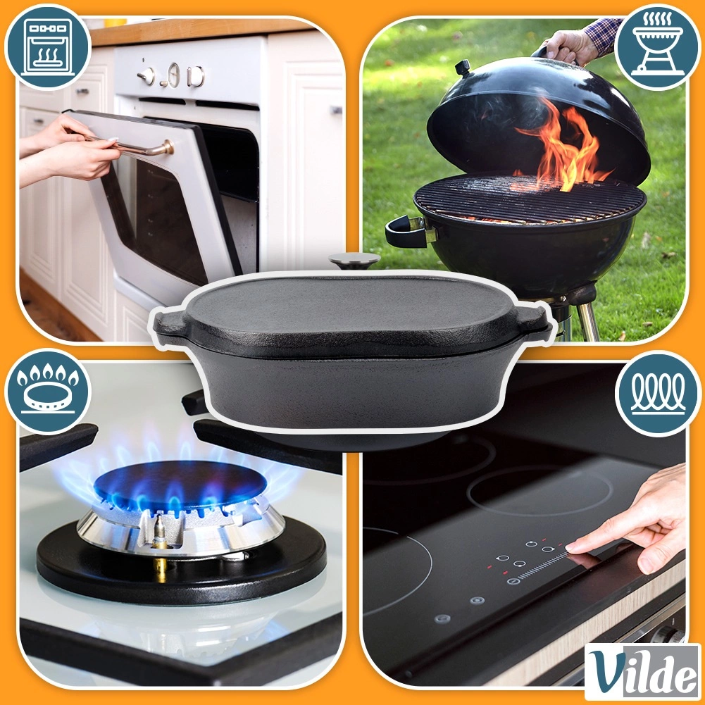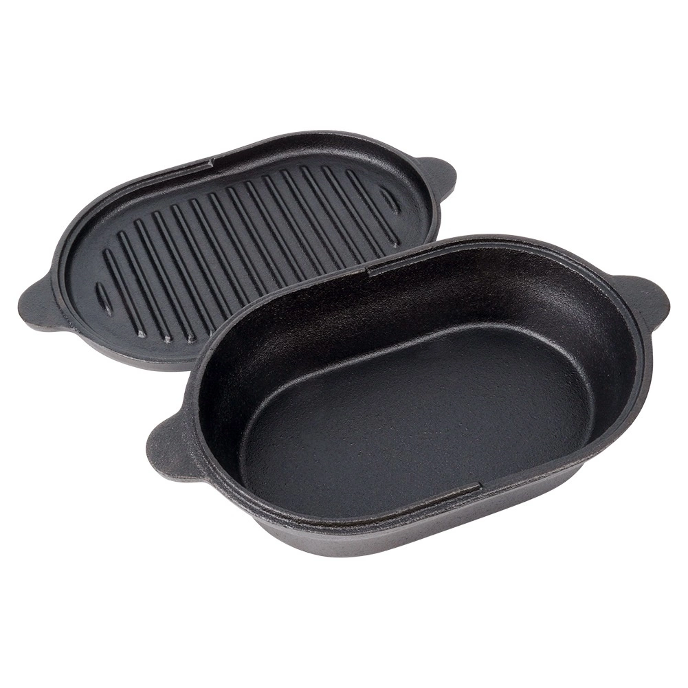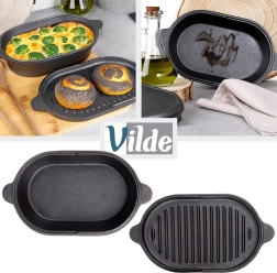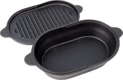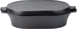 Тази овална чугунена тава с практичен капак 2 в 1 е създадена за всекидневно и празнично готвене. Долната част служи като по-дълбока тава за месо, картофи или зеленчуци, докато капакът с оребрено дъно функционира като самостоятелен скара-тиган за перфектно запичане и решетъчен ефект.