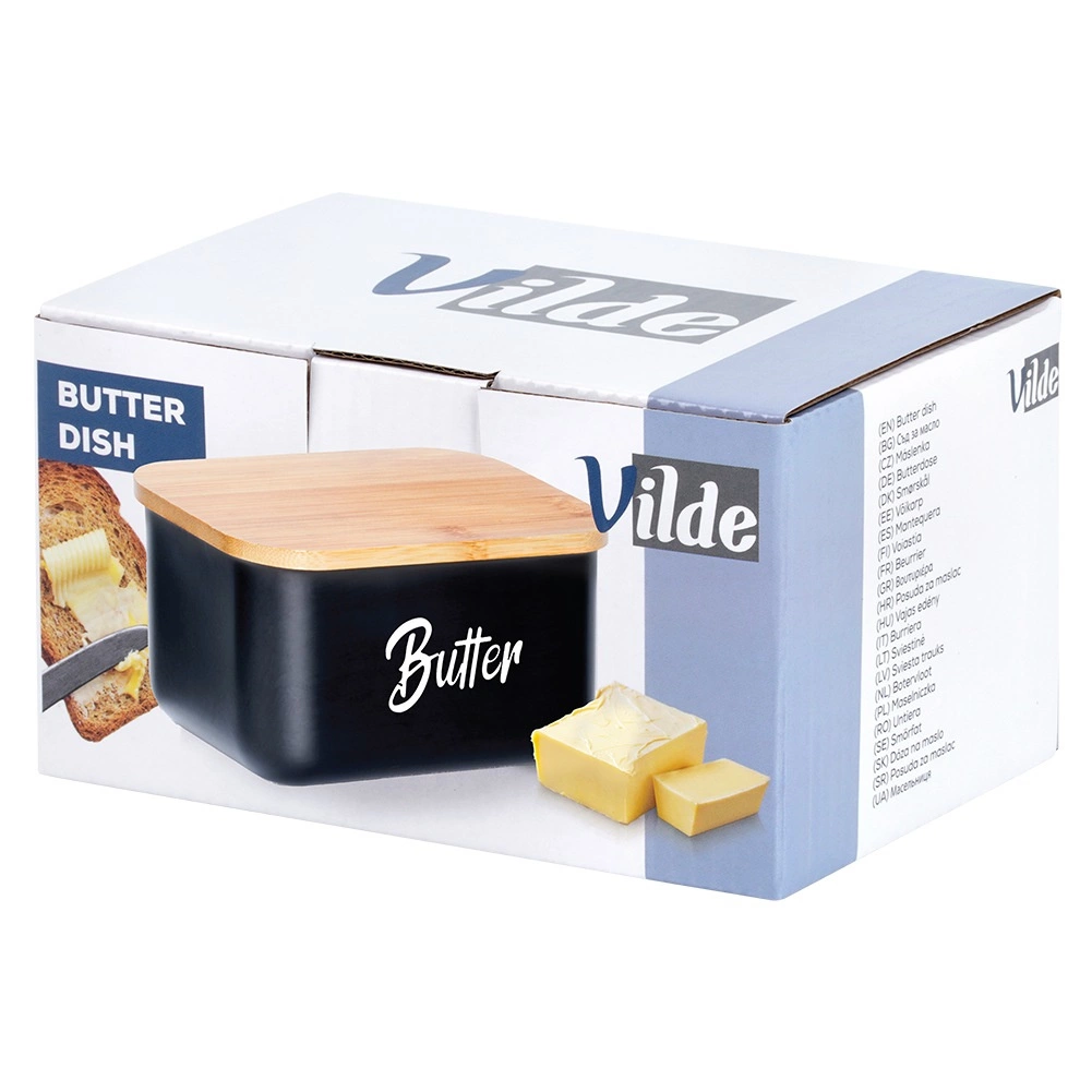 Елегантна черна масленка от стомана с естествен бамбуков капак, която поддържа маслото свежо по-дълго и изглежда красиво на масата. Идеална за ежедневна употреба – както за съхранение в хладилник, така и за сервиране. Здрава стомана, стилен дизайн и лесно почистване за максимално удобство.