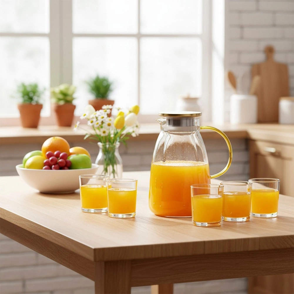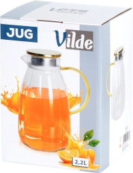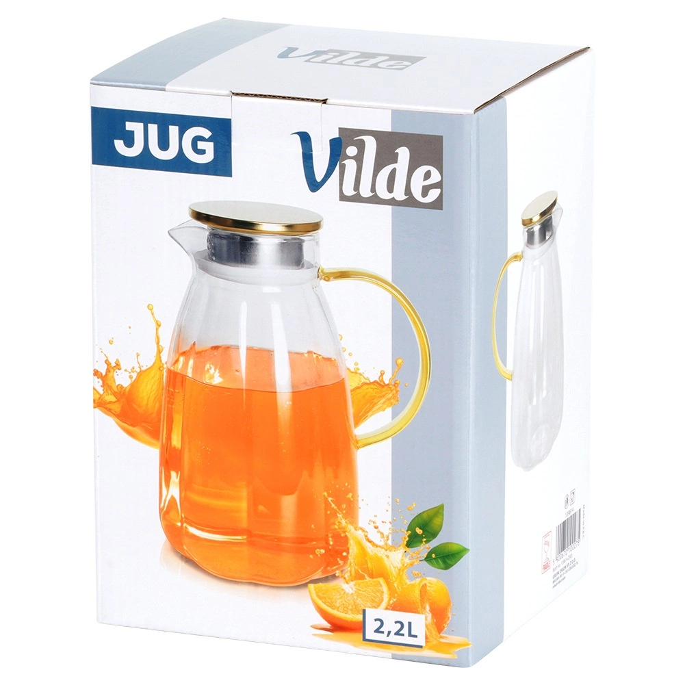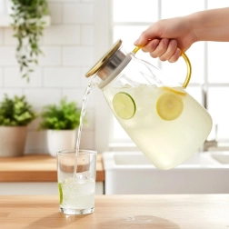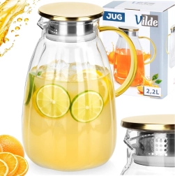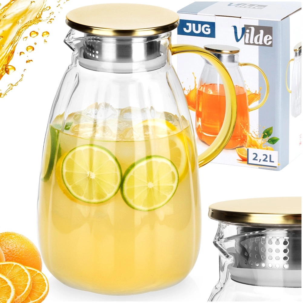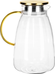 Стилна и практична стъклена кана, която изпъква на всяка маса. Прозрачното, висококачествено дебелостенно стъкло красиво откроява резенчета лимон, билки или кубчета лед, докато златистият капак от неръждаема стомана предпазва напитката от замърсявания и насекоми. Ергономичната жълта дръжка и оформеното гърло осигуряват безопасно и прецизно наливане без капки.
