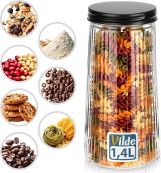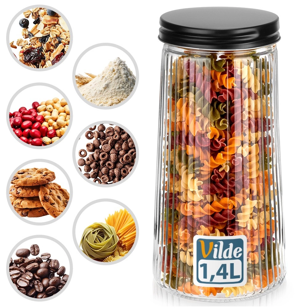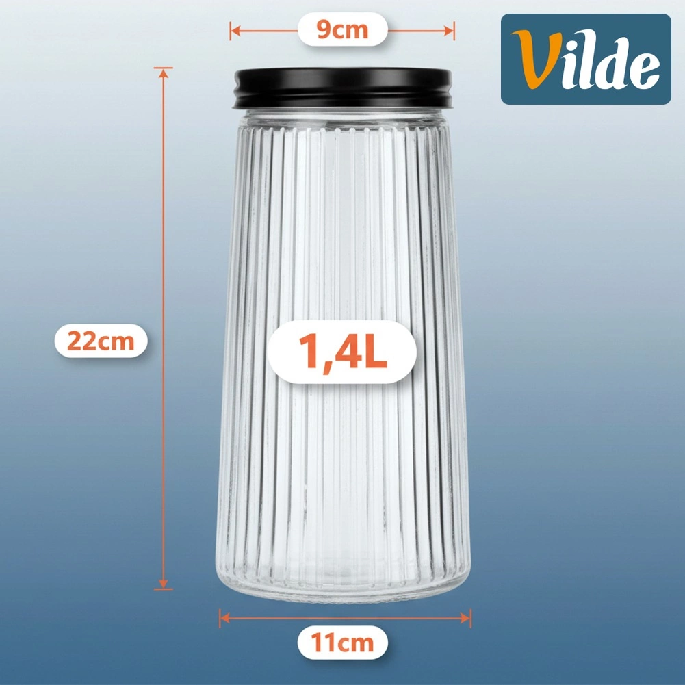 Елегантен стъклен буркан с вместимост 1,4 л и черен винтов капак, който запазва храните свежи по-дълго. Изработен е от издръжливо боросиликатно стъкло с декоративно оребрение, което осигурява стилен вид и сигурен захват. Благодарение на въздушно и водонепроницаемото затваряне е идеален за кафе, паста, брашно, ядки или мюсли, а прозрачното стъкло позволява бърза проверка на съдържанието.