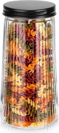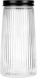 Този практичен и модерен кухненски буркан с вместимост 1,4 л помага да поддържате килера подреден, а храните – свежи. Висококачественото боросиликатно стъкло устоява на температурни промени, а оребрената повърхност придава модерен вид и по-добра стабилност в ръката. Винтовият метален капак в черен цвят осигурява плътно затваряне и защитава аромата и крехкостта на продуктите.