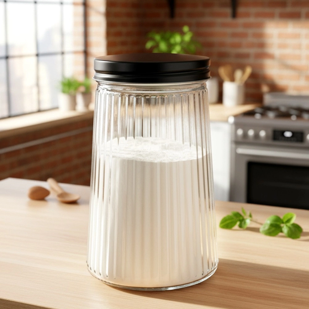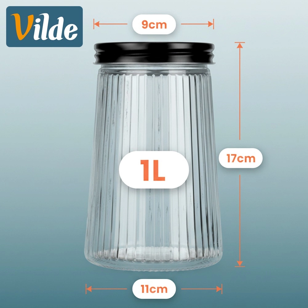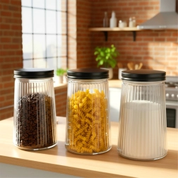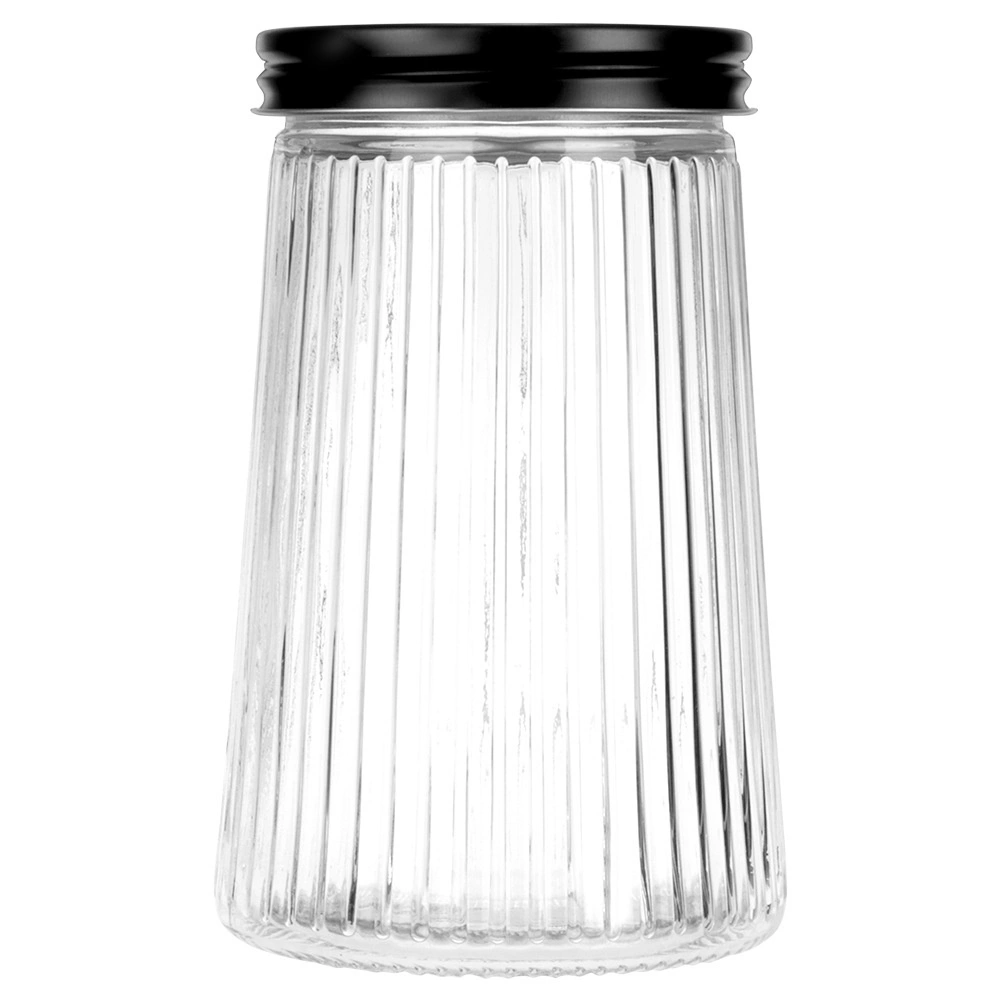 Практичен стъклен съд с обем 1 литър и винтов метален капак поддържа храните ви по-дълго свежи и красиво подредени. Изработен от устойчиво боросиликатно стъкло с елегантен оребрен дизайн, позволява лесен контрол на съдържанието и количеството. Идеален за кафе, паста, захар, ядки и други насипни продукти.