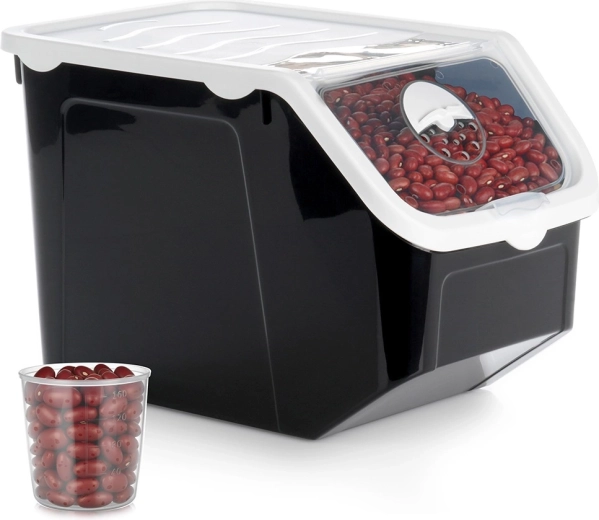 Контейнерът е идеален за картофи, лук, чесън, както и за паста, бобови, храна за домашни любимци или прахообразни смеси. Качествената пластмаса без BPA е безопасна за храни, подходяща за фризер и съдомиялна. Практичната мерителна чашка с деления 40–160 мл улеснява точното дозиране.
