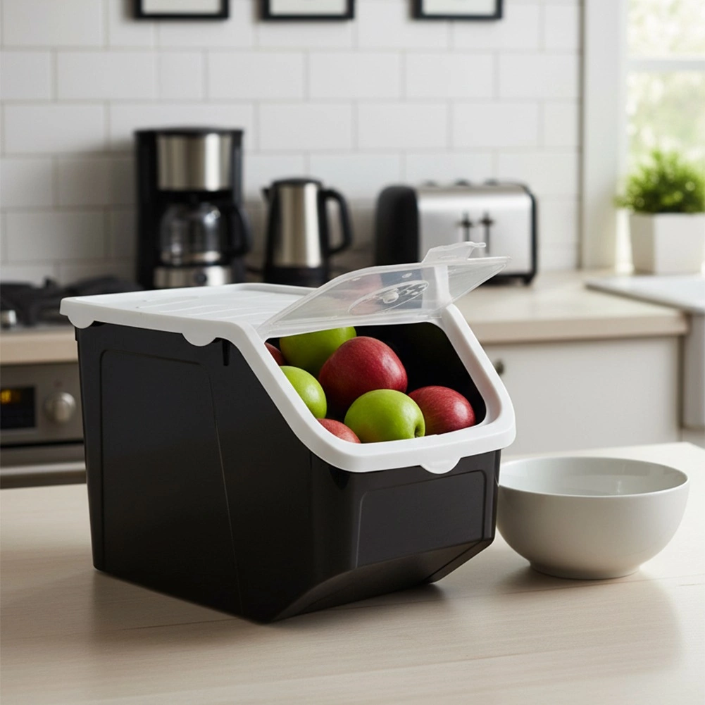 Поддържайте ред в килера и на плота с просторния контейнер от 12 л. Благодарение на прозрачния отваряем люк бързо ще проверите съдържанието и лесно ще вземете нужното количество. Уплътняващият бял капак предпазва от влага и миризми, а регулируемата вентилация помага да се запазят плодовете и зеленчуците свежи по-дълго.