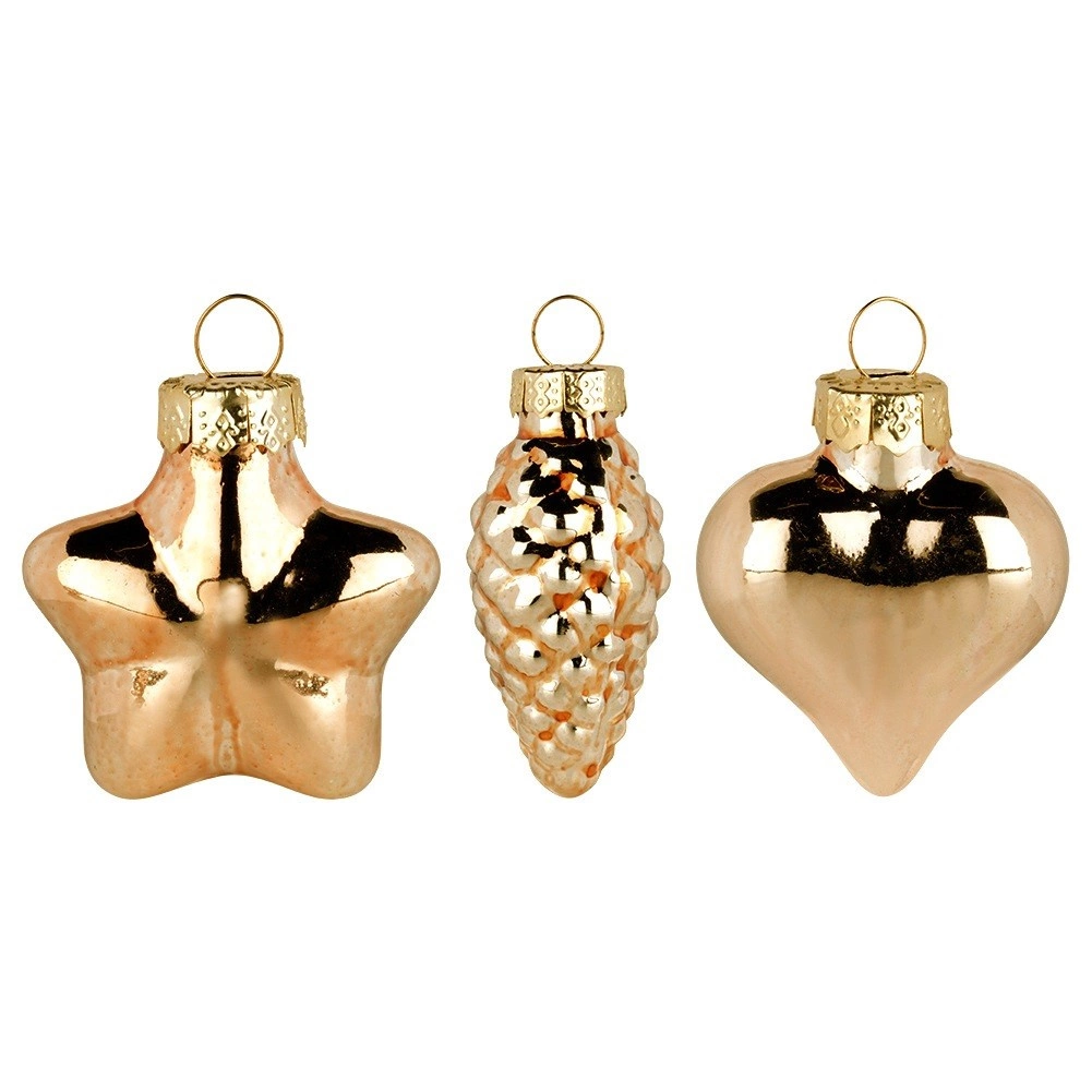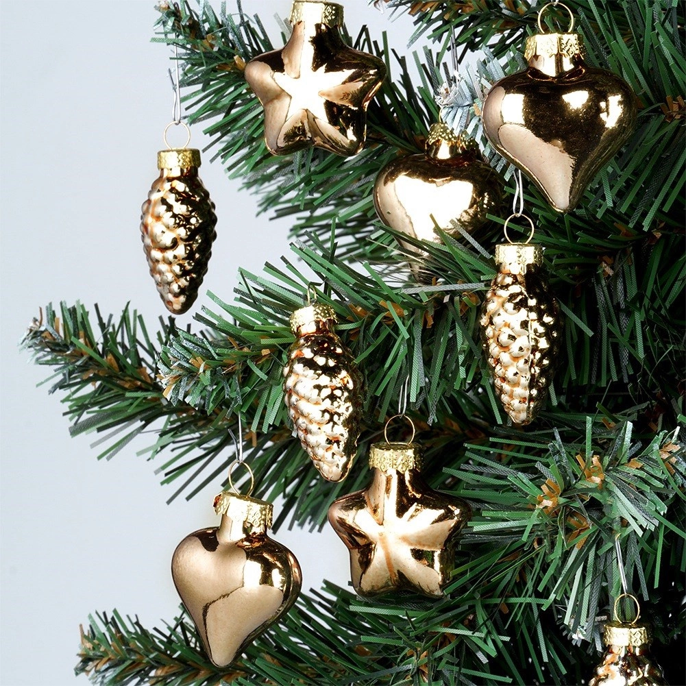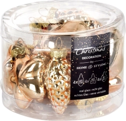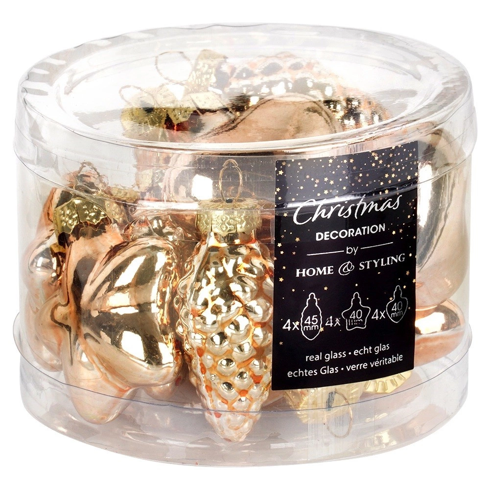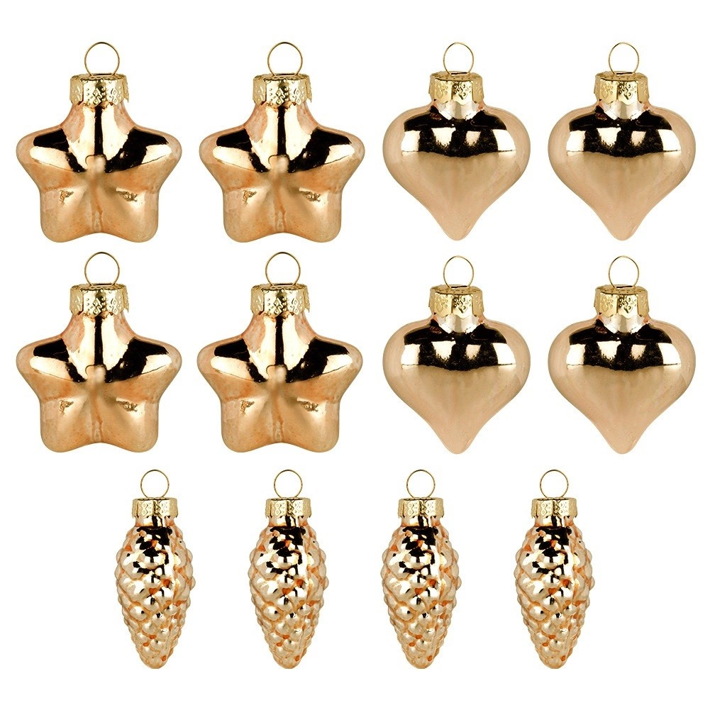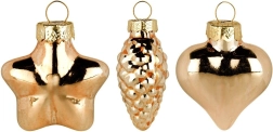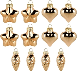 Елегантен комплект от 12 стъклени коледни украшения в луксозна златна цветова гама, които озаряват всяка елха и празнична украса. Комбинацията от форми сърчица, звездички и шишарки с размер 4–4,5 см създава хармоничен и стилен ансамбъл. Украшенията са от истинско стъкло, имат лъскава, силно отразяваща повърхност и благодарение на халкичките се закачат лесно на клонки, гирлянди и венци.