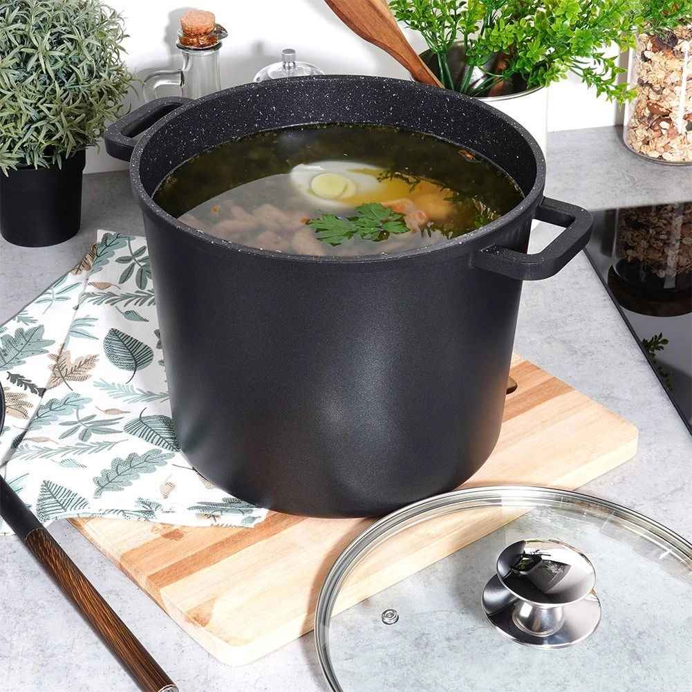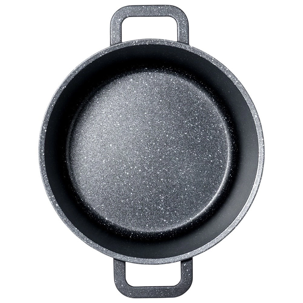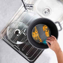 Здравата висока тенджера GRANDE е изработена от устойчив алуминий с вътрешен нелеплив гранитен слой PFLUON, който е устойчив на надраскване и високи температури. Готвенето е бързо, равномерно и енергийно ефективно – идеално за бульони, сосове и еднопотови ястия. Капакът от закалено стъкло с неръждаем ръб и вентилационен отвор позволява контрол на готвенето без излишна загуба на топлина.