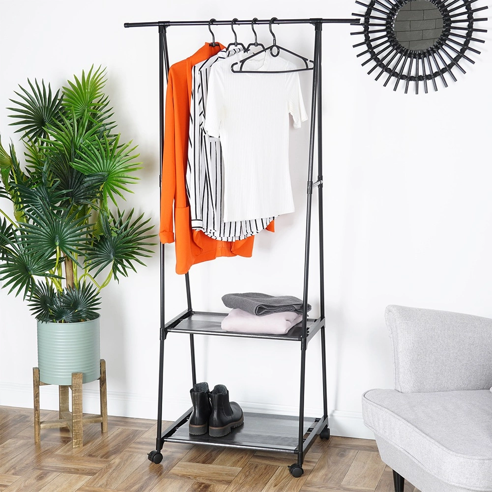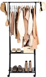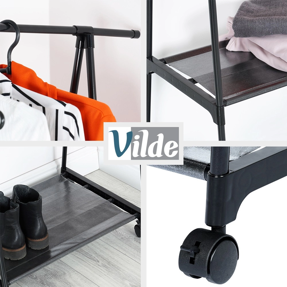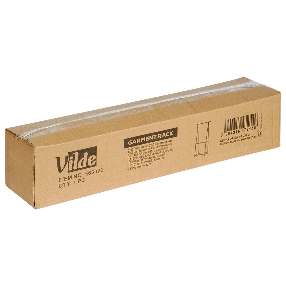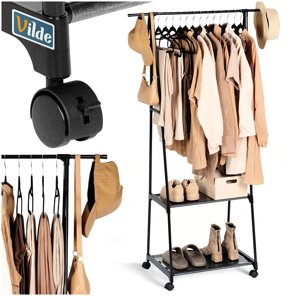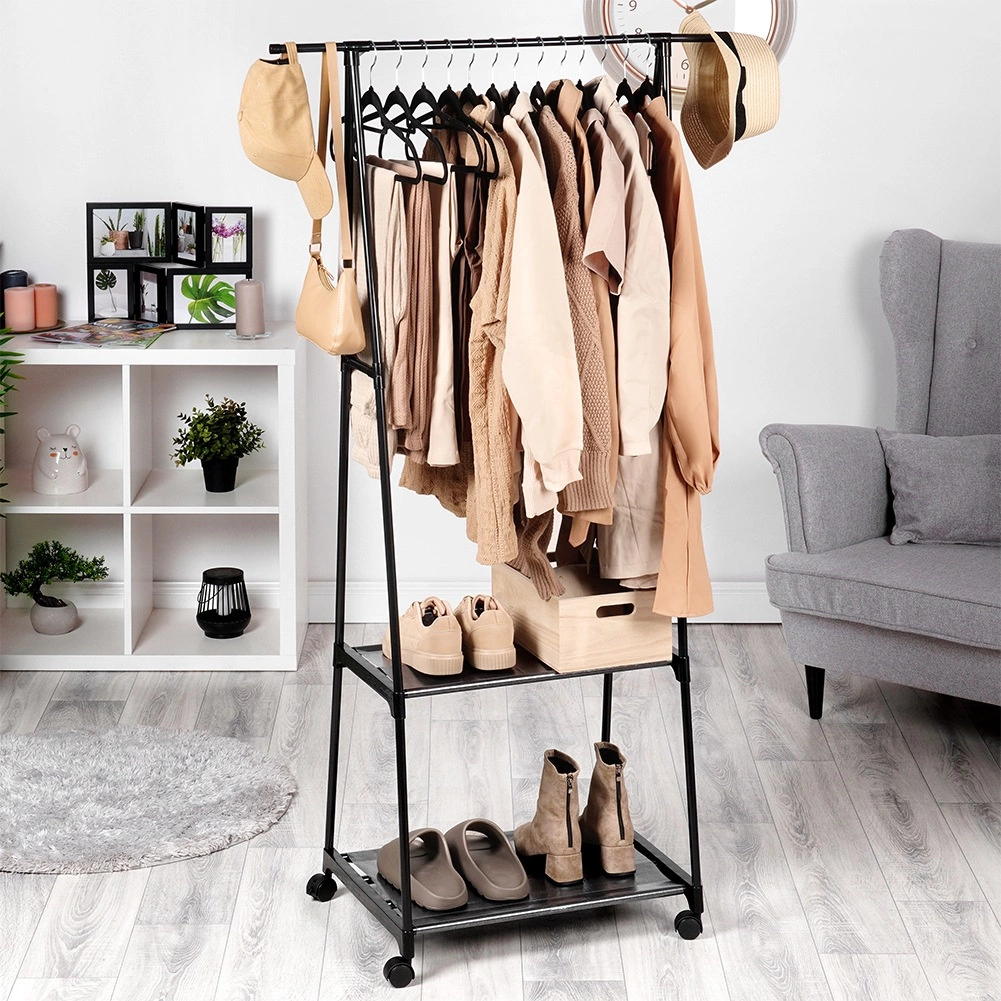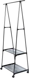 Елегантната закачалка в индустриален loft стил предлага просторен горен лост за окачване на облекла и два долни рафта за обувки, чанти или кутии за съхранение. Цялостната метална изработка в черно е здрава, стабилна и лесна за поддръжка, а текстилните рафтове от полиестер са леки и издръжливи.