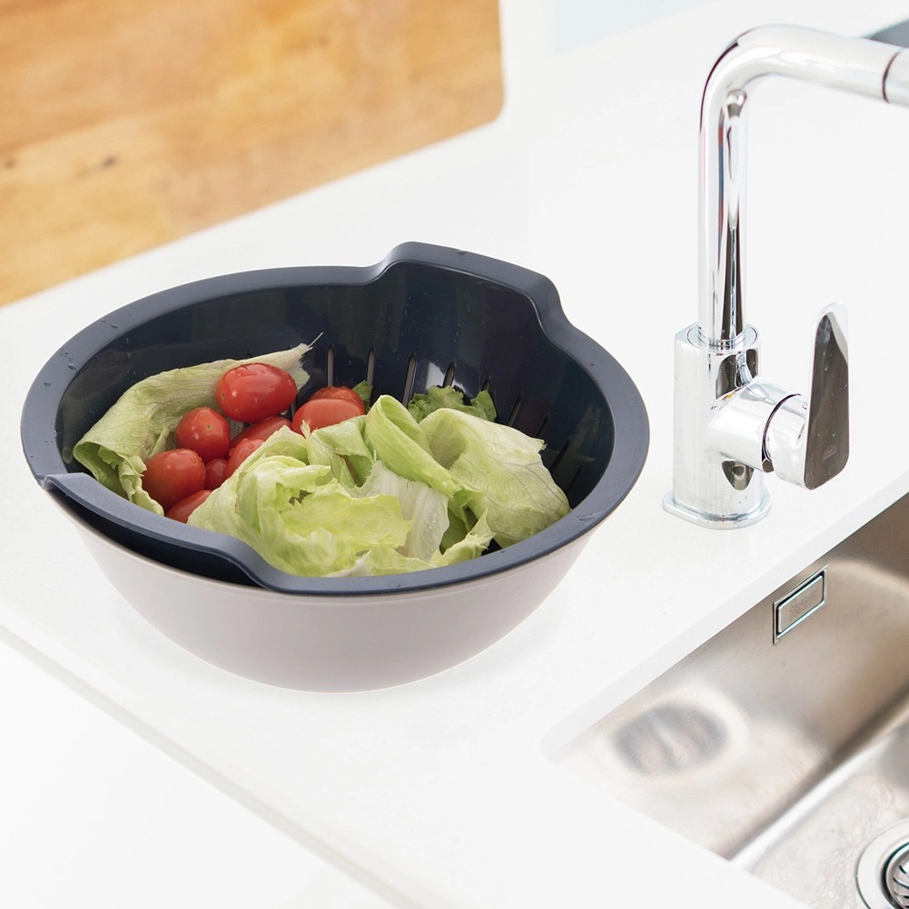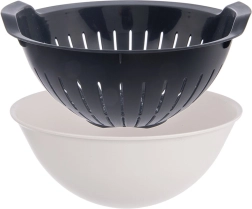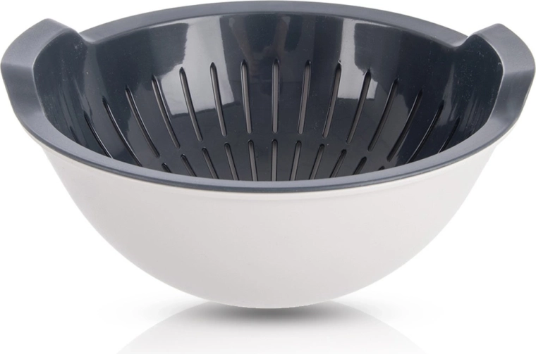 Практичен комплект 2в1 цедка + купа, който улеснява ежедневното измиване, изплакване и отцеждане на плодове, зеленчуци и паста. Подвижната цедка позволява водата свободно да се оттича в купата – без разплискване. Изработено от качествен пластмаса без BPA, издръжливо и леко. Подходящо за миялна, а купата и за микровълнова фурна.
