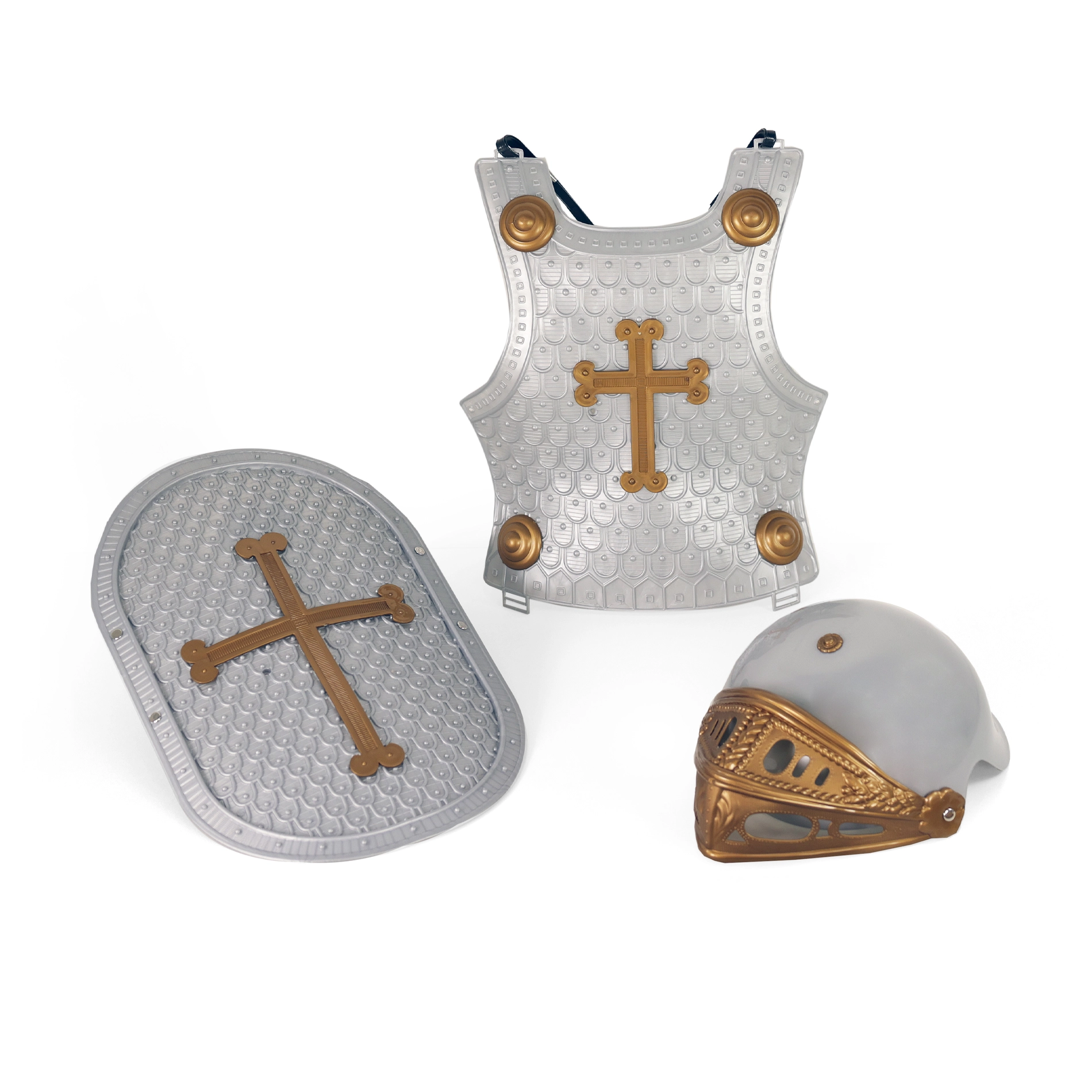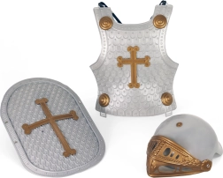 Комплектът включва всичко, от което малките рицари се нуждаят, за да изпълнят своите героични мечти – меч с кания, щит, шлем и елека.